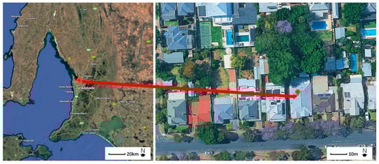 The study house is located in Prospect, in the Adelaide Metropolitan Area in the State of South Australia (as shown in Figure 2). The location has a warm-temperate climate [36], classified as Köppen–Geiger Csa, with four distinct seasons. January and February are typically the hottest months, with average maximum temperatures ranging from 29 °C to 35 °C, and they are often accompanied by heatwaves extending into March, occasionally reaching temperatures exceeding 40 °C. In contrast, June, July and August bring cooler temperatures, with average maximum temperatures ranging from 15 °C to 16 °C, as shown in Figure 3.