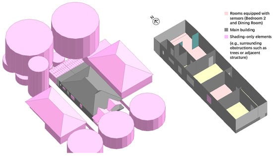 After the initial DesignBuilder model was developed (as shown in Figure 5), the model underwent a calibration process to ensure that the simulated indoor temperatures, calculated using the EnergyPlus (version 22.2.0) dynamic simulation engine, without heating and cooling, closely matched the actual indoor temperatures recorded over at least 14 consecutive days in both warm and cool months. The periods of 24 June to 8 July 2022 and 17 November to 1 December 2022 were identified as having no active air conditioning or heating in the study house.