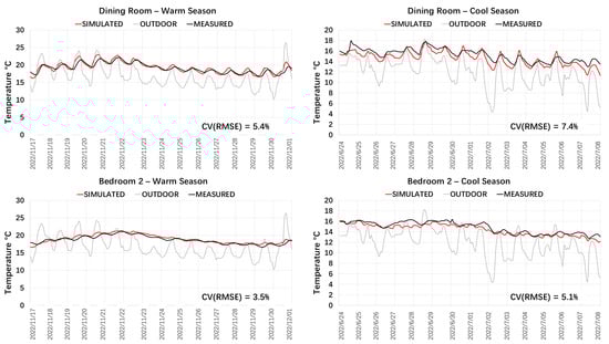 To assess the simulation model’s accuracy, the difference between the measured and simulated data was calculated using the coefficient of variation (CV) of the Root Mean Squared Error (RMSE). A CV (RMSE) value of less than 10% was considered an acceptable result for calibrating the digital model [46,47]. Using an iterative process of adjusting input variables (i.e., construction materials thermal properties, air infiltration rates and shading and neighbouring elements) in the model, following the manual methodology by Možina et al. [48], the final calibrated model showed a CV (RMSE) of 5.1% for Bedroom 2 and 7.4% for the Dining Room during the cool season, and a CV (RMSE) of 3.5% for Bedroom 2 and 5.4% for the Dining Room during the warm season, as shown in Figure 6.