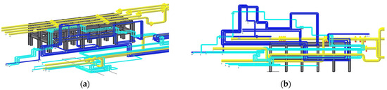 To demonstrate the applicability and feasibility of the proposed fuzzy-integrated MCDM framework, this study applies the method to an industrial piping construction project. The validation process utilizes a detailed 3D BIM model, shown in Figure 5, which accurately reflects the site conditions. The project involves a large-scale piping network with a length of 47.68 m, a width of 35.44 m, and a height of 21.17 m, with pipe diameters varying from 80 mm to 300 mm.
