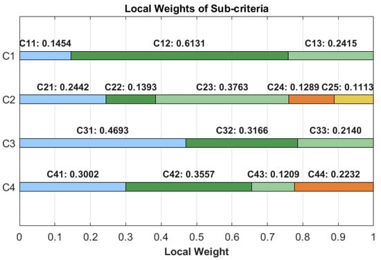 Based on the expert assessment, the weight values of the main criteria and their corresponding sub-criteria were determined using the fuzzy AHP method. According to Section 3.2, the fuzzy AHP procedure involved synthesizing the judgments from the 15 experts into triangular fuzzy number (TFN) matrices, calculating Coefficient of Variation (CV), and verifying consistency (CR) to ensure reliable weights.