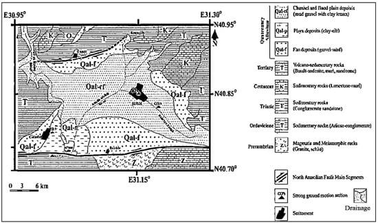 Geological and stratigraphic framework of the Düzce Basin showing Plio–Quaternary alluvial and lacustrine deposits (Qal2, Qal3) [28,30,31].