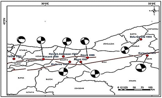 Seismotectonic framework of the Düzce Basin showing the North Anatolian Fault (NAF), major surface ruptures of the 1999 Kocaeli and Düzce earthquakes, modified [55,56,70,71,72,73].