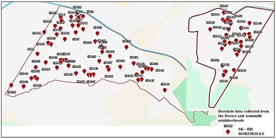 A comprehensive subsurface investigation program was executed across the designated borehole locations to characterize the geotechnical conditions governing the project site. The dataset used in this research was obtained from 55 borehole for CL soils and 70 boreholes for CH soils drilled in the Darıca and Azmimilli neighbourhoods of Düzce city centre (Figure 4). Boreholes were advanced using rotary drilling techniques suitable for retrieving both disturbed and undisturbed samples. The boreholes were logged to various depths depending on lithological continuity, and undisturbed soil samples were collected for laboratory analysis (Figure 5). All tests were carried out in accordance with ASTM [83] and TSE EN ISO [84] standards to ensure data reliability and reproducibility.