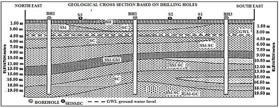 Borehole data collected from the Darıca and Azmimilli neighbourhoods reveal cyclic stratification composed of fine-grained gravel, silty sand, silt, and clay interlayers. The Qal2 unit consists primarily of brown-to-grey clayey–silty sand and gravel, while Qal3 deposits comprise thicker (up to 40 m) layers of silty clay and clayey silt that gradually transition to coarser sediments toward the basin margins. Standard Penetration Test (SPT-N30) values range from 10 to 50, indicating soil densities from loose to dense states, and reflecting the heterogeneity of depositional environments within the basin (Figure 6) [28].