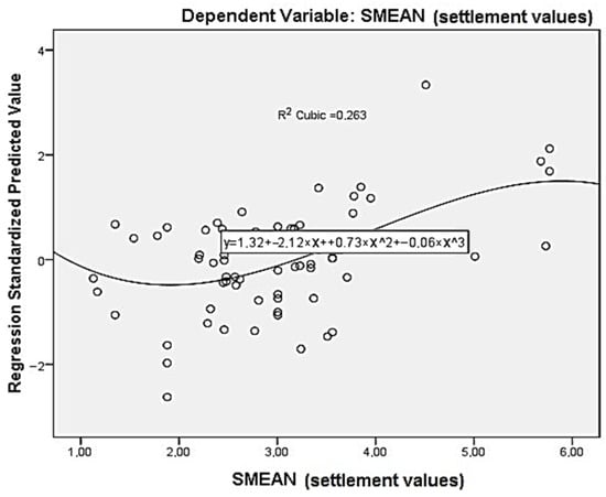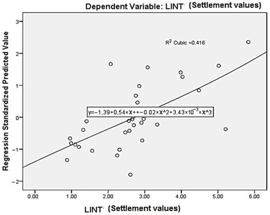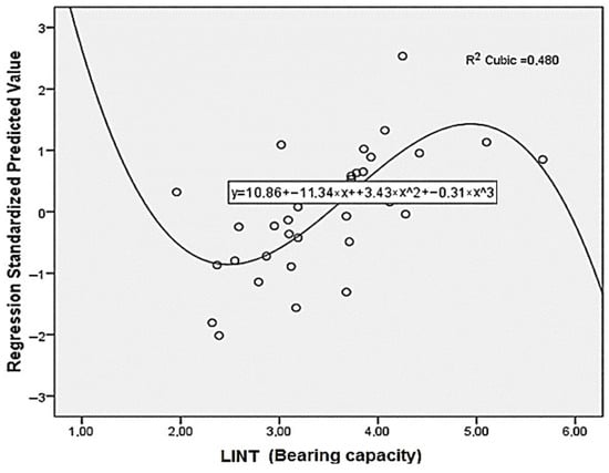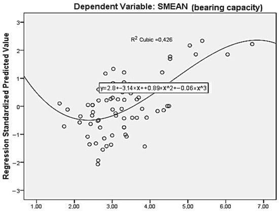 Following correlation analysis, multiple regression models were developed to predict both bearing capacity and settlement as dependent variables. Regression diagnostics—such as R2, adjusted R2, F-statistic, and standard error of estimate—were used to evaluate model reliability. Stepwise regression was applied to identify the most influential predictors while minimizing multicollinearity.