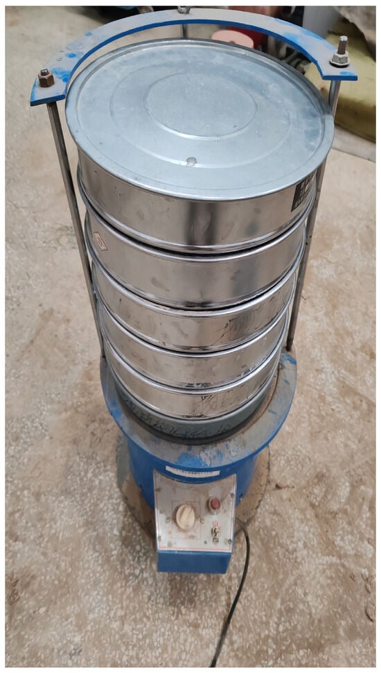 This study is based on the tunnel slag processing and reuse project of the Huizhou Qingyuan section of the Shanzhan Expressway (western Guangdong, China), and conducts a meso-mechanical parameters study on the graded crushed stone used for filling the pavement base. The original particle size distribution of the crushed stone soil retrieved from the site was obtained by sieving using a vibrating-screen machine. Crushed stone samples and the vibrating-screen machine are shown in Figure 3 and Figure 4. After the grading was adjusted, CBR tests were performed to obtain data for subsequent simulation tests.