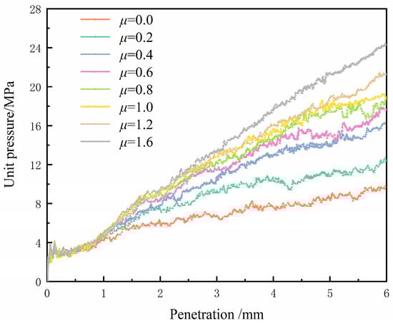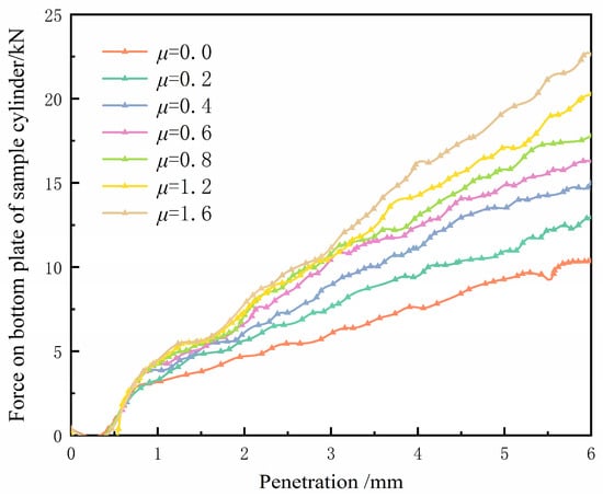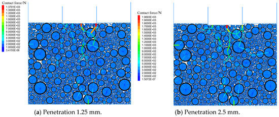 There were “steps” after a penetration of 3.5 mm in Figure 12, which was similar to the stress softening phenomenon. The penetration force no longer increased at the original rate until the penetration amount increased to about 4.5 mm, which suggested that the overall particles of the sample underwent a large displacement during a penetration of 3.5~4.5 mm, and the particle contact key mainly occurred as a tangential failure simultaneously. The main reason may have been that a more intense particle position redistribution occurred, so the force chain network structure was reconstructed, which strengthened the overall resistance to deformation of the sample.