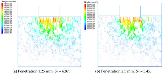 By comparing the subgraphs in Figure 11, it can be concluded that when the penetration amount was small, the direction of the particle displacement vectors was mainly vertical. As the penetration amount increased, except for the inverted triangular area beneath the penetration rod, the displacement vectors of the sample particles primarily developed in a “herringbone” shape. The larger the penetration amount, the more obvious the phenomenon, and the whole sample profile finally formed “X”-shaped cracks. The particles in the middle of the bottom of the sample were the most stable and the displacement was the smallest.