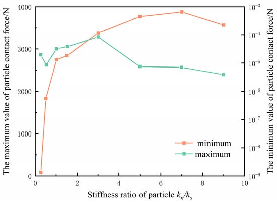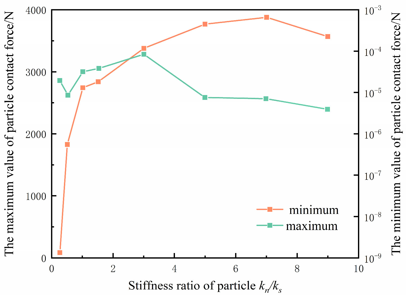 Figure 13 shows the force chain properties of each particle stiffness ratio. The maximum contact force of the particles increased first and then decreased with k n / k s = 3 as the boundary, and the change range was small, as shown in Figure 13. The growth was faster at k n / k s < 3, and the minimum value of contact force developed slowly while k n / k s > 3. When the normal stiffness of the particles was small, the range of the contact force field and the gradient growth rate caused by the penetration were weakened by the normal elasticity of the particles, resulting in a smaller stress at the two corners of the bottom of the specimen far from the bottom of the penetration rod. With an increase in the normal stiffness of the particles, the contour of the particle contact force field caused by penetration extended outward, which made its proportion in the bottom particle contact force increase sharply. As the stiffness ratio of particles k n / k s increased, the contact between particles became more rigid. This meant that, under the same external force, the deformation between particles decreased, resulting in an increase in contact force. Consequently, the maximum contact force between particles also rose with an increasing stiffness ratio. Overall, changes in the stiffness ratio influenced the interparticle forces, causing variations in both the maximum and minimum contact forces. This phenomenon is significant in materials science and engineering, as it aids in understanding and predicting material behavior under different conditions. Although these meso-level transitions in force chain architecture and contact density are evident under varying stiffness ratios ( k n / k s ), they do not manifest as significant macroscopic fluctuations in CBR values. As illustrated in Figure 12, the CBR curves exhibit negligible sensitivity to these parameter changes. This suggests a compensation mechanism within the granular fabric: internal structural adjustments—such as enhanced contact rigidity facilitating more efficient force redistribution—effectively stabilize the assembly. Consequently, the granular structure maintains overall load-bearing stability, ensuring that the bulk performance index remains largely unaffected despite the underlying microscopic variations.