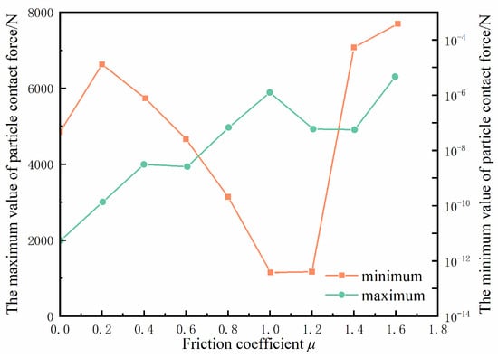 In the actual CBR test process, the force conditions of the sample particles are complex. The model used in this study was developed to examine the influence of particle meso-mechanical parameters—specifically, the stiffness ratio k n / k s and the friction coefficient μ —on the CBR value. To gain deeper insights into the force transmission within the particle system, a force chain model was integrated with the initial model. This combined approach allowed us to explore the relationship between particle properties and the force transfer pathways in the particle flow model, clarifying how individual interactions at the mesoscopic level influenced the material’s overall mechanical behavior. The maximum value of the particle contact force and the number of contacts in the model were taken using a penetration amount of 6 mm to ensure a reasonable and complete value of the force-chain-related data.