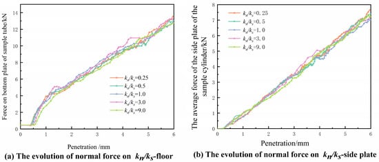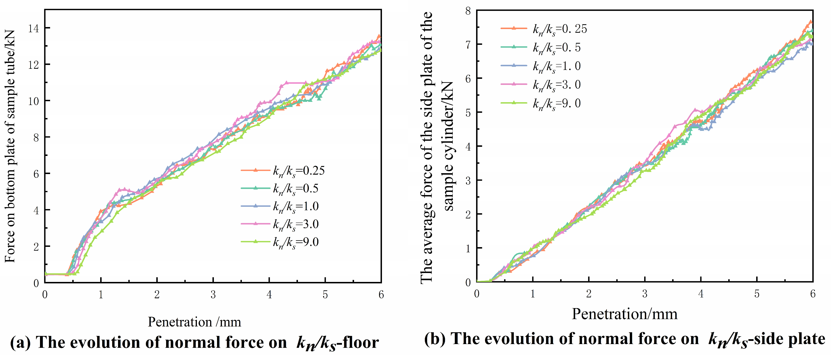 Figure 17. The evolution of the normal force on the boundary of the sample corresponding to different k n / k s .