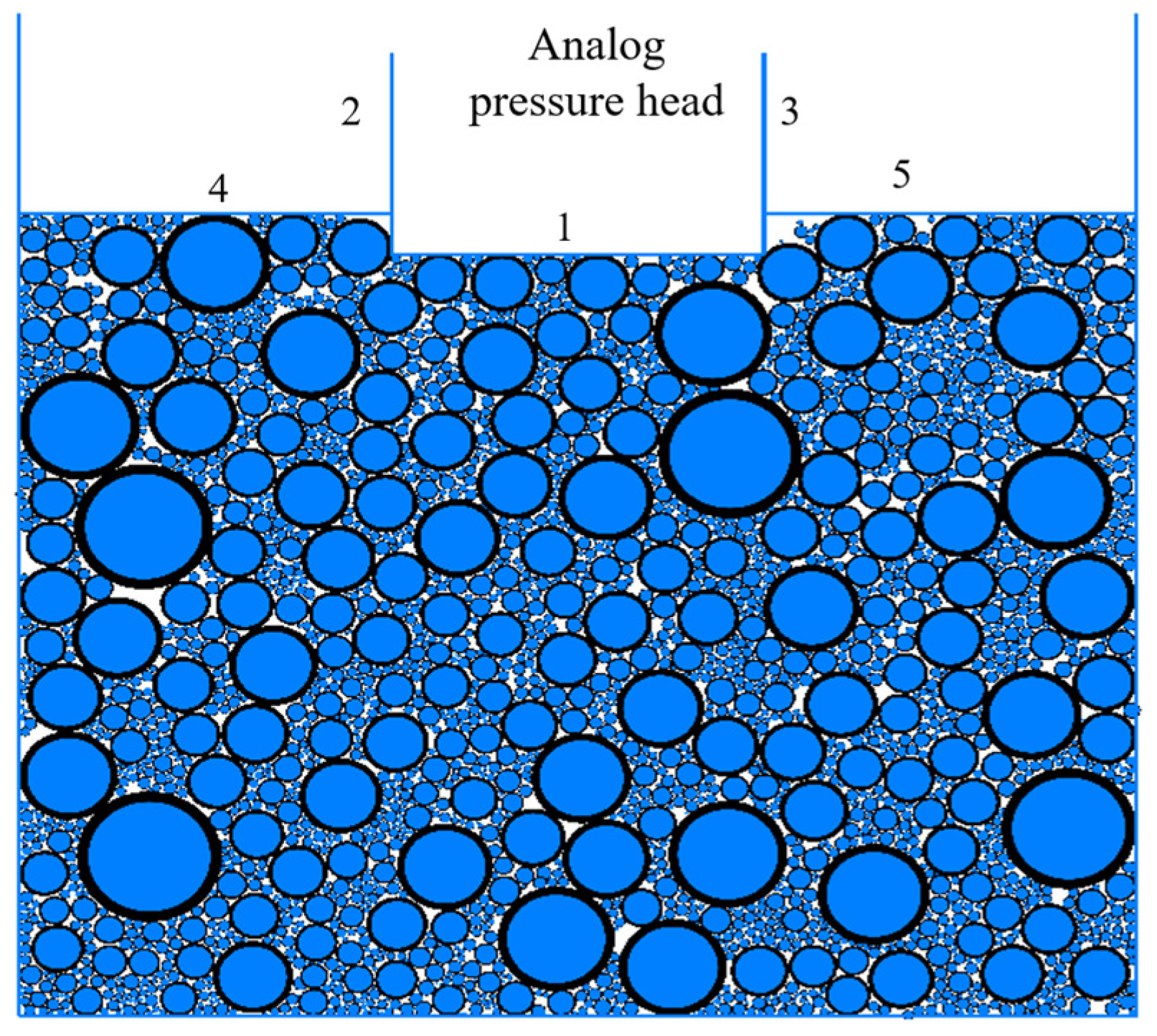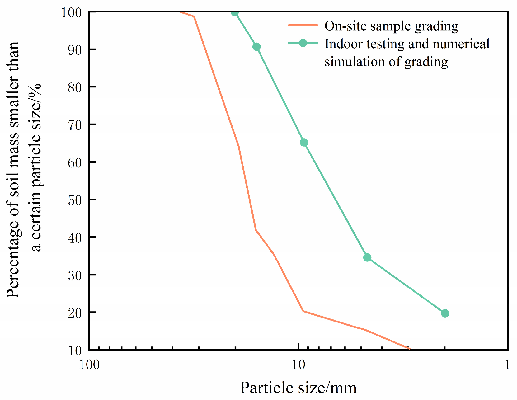 To eliminate the size effect of the sample in the simulation experiment and simplify the experimental process, the particle grading and sample size used in the numerical simulation experiments were the same as those used in the laboratory experiments. The minimum particle size was set to 2 mm to ensure the efficiency of the numerical simulation experiments.