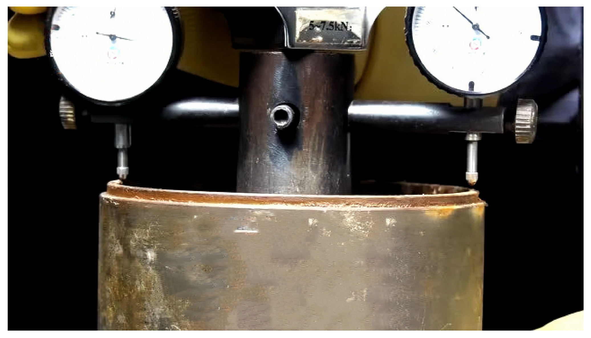To verify the effectiveness of the model, CBR tests were conducted and the experimental results were compared with the simulation results. Figure 7 shows the process of indoor CBR test, and Figure 8 shows a comparison between CBR curves from the laboratory test results and from the numerical simulation. As shown in Figure 8, the trends of the two curves are consistent. Moreover, the simulated curve shows a rapid initial increase in unit pressure, aligning with the actual test results and confirming the simulation’s validity.