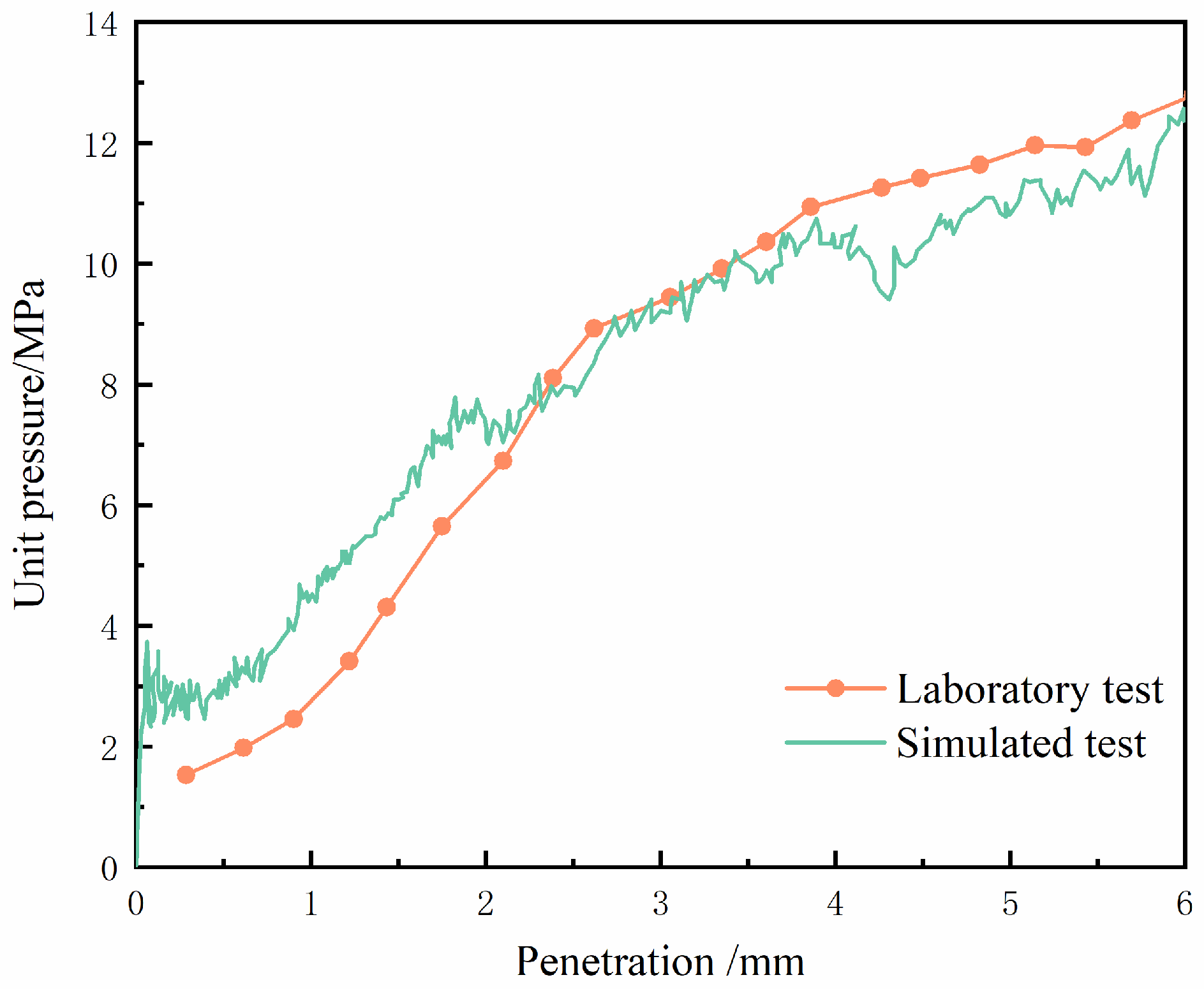 To quantitatively evaluate the model performance beyond qualitative visual comparison, the experimental penetration curves were digitized and compared with the simulation results using statistical metrics. The root mean square error (RMSE) between the laboratory and simulated unit pressures across the full range (0–6 mm) is 0.73 MPa, with a mean absolute error (MAE) of 0.64 MPa. Notably, the coefficient of determination (R2) is 0.97, indicating a strong correlation and excellent overall fit. These metrics confirm that the DEM model possesses high fidelity in replicating the load-bearing response of the tunnel waste aggregates.