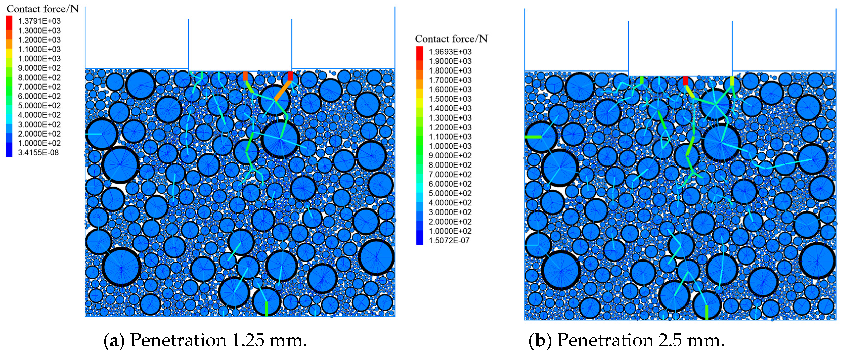 After the loading condition of the sample boundary met the test requirements, a constant speed was given to the simulated indenter to press it into the sample. A speed of 1.25 mm/min was selected as the penetration speed, and the loading was stopped when the penetration distance increased to 6 mm. A penetration depth of 6 mm was adopted to surpass the standard CBR measurement thresholds of 2.5 mm and 5.0 mm. This ensures robust validation against experimental benchmarks while facilitating a comprehensive analysis of contact force evolution and particle interactions. This selection strategically balances the model’s capacity for meso-mechanical investigation with computational overhead in the PFC environment; further penetration would significantly increase simulation time without yielding proportional gains in physical insight for the current research scope.