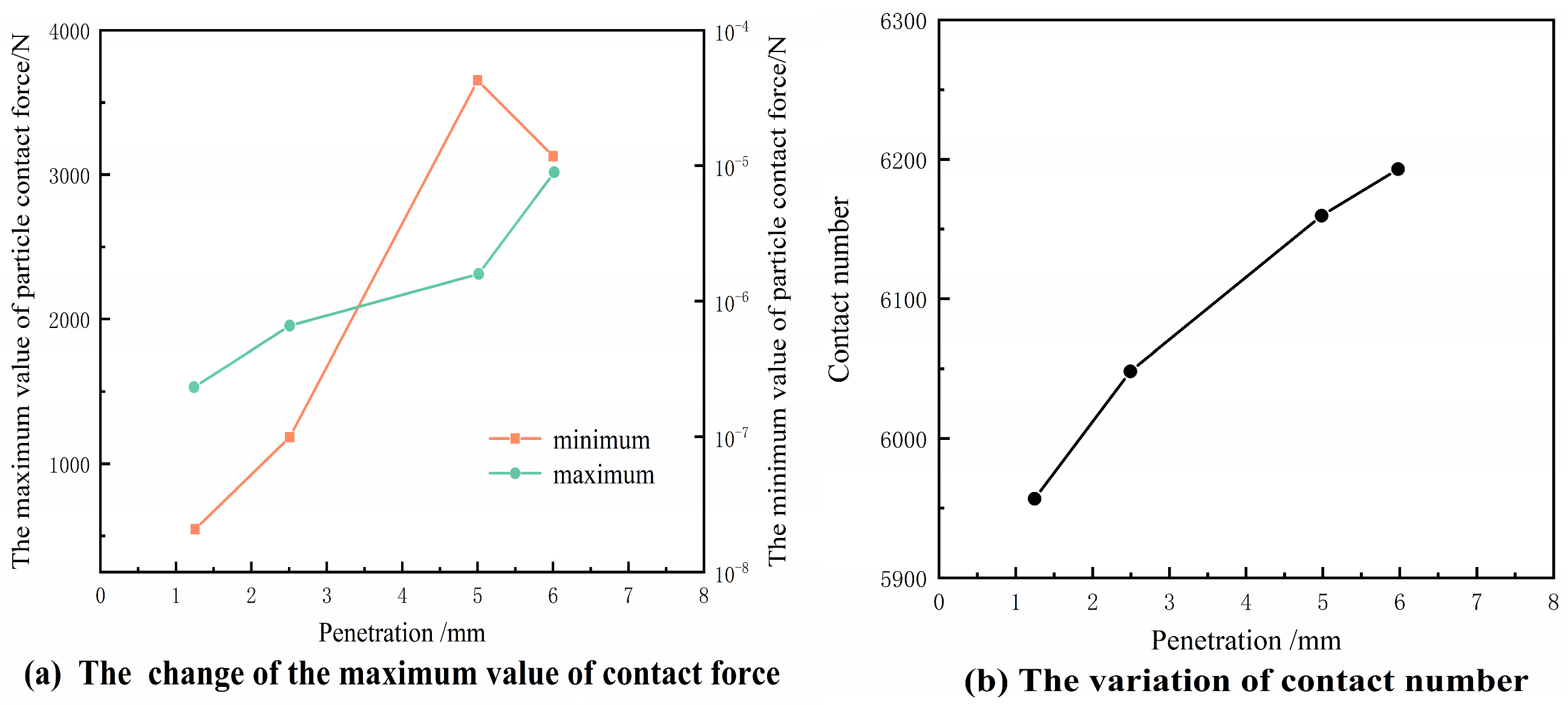 The corresponding change in the maximum contact force and the number of contact bonds is shown in Figure 10. The maximum and minimum values kept rising with increasing penetration, indicating that the contact force of all particles in the sample increased with an increase in penetration. When the force chain extended to the bottom of the whole specimen, the minimum contact force occurred between particles near the upper load plate.