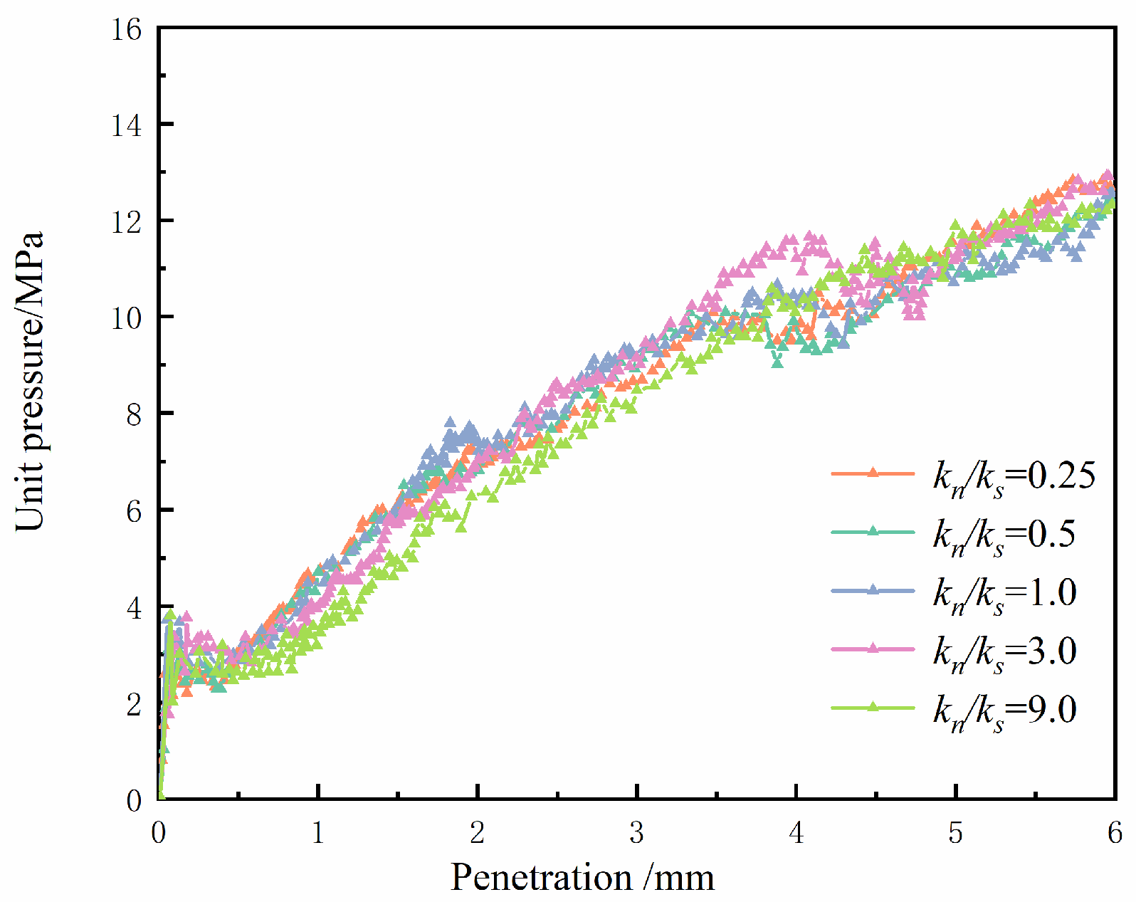The CBR values and curves are shown in Figure 12. From this diagram, it can be seen that k n / k s had little influence on the CBR value. The CBR value corresponding to each variable fluctuated around a fixed value, and the CBR curve shapes corresponding to different k n / k s values were not very different.