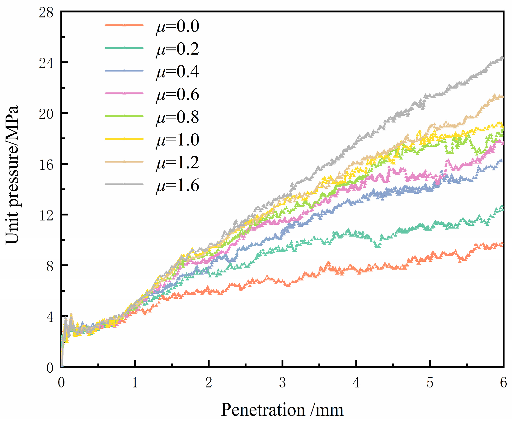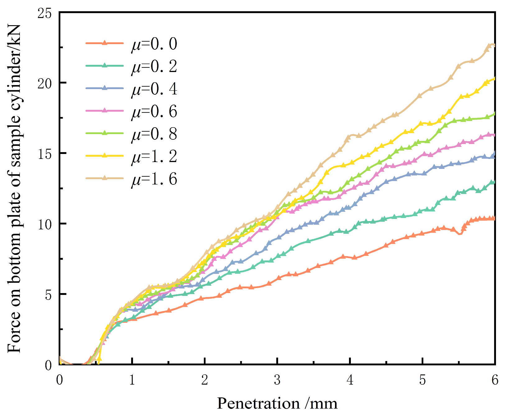 The unit pressure on the surface of the sample increased accordingly as the penetration amount increased, and force chains were formed between the sample particles to transfer stress during the test. The particle contact force chains diffused uniformly in the sample during the compaction and elastic deformation of the sample.