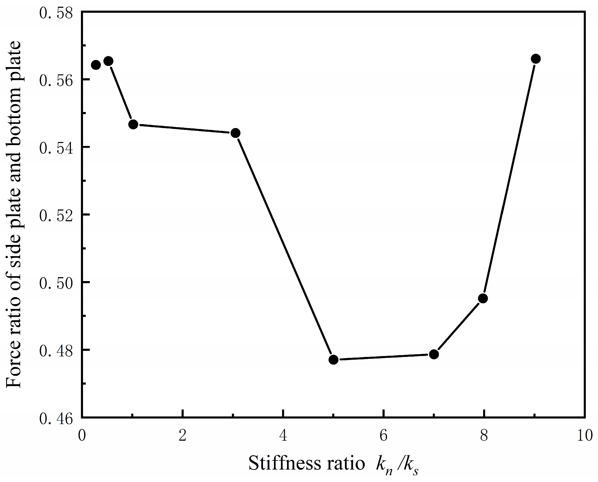 Figure 18. The change in the ratio of the normal force on the side plate and the bottom plate of the sample cylinder with k n / k s .