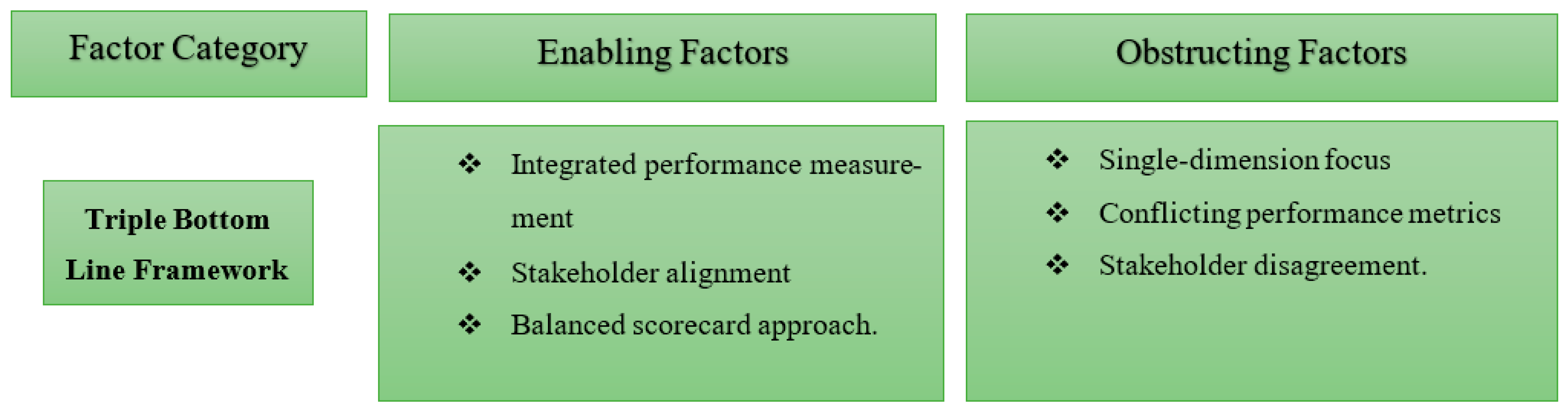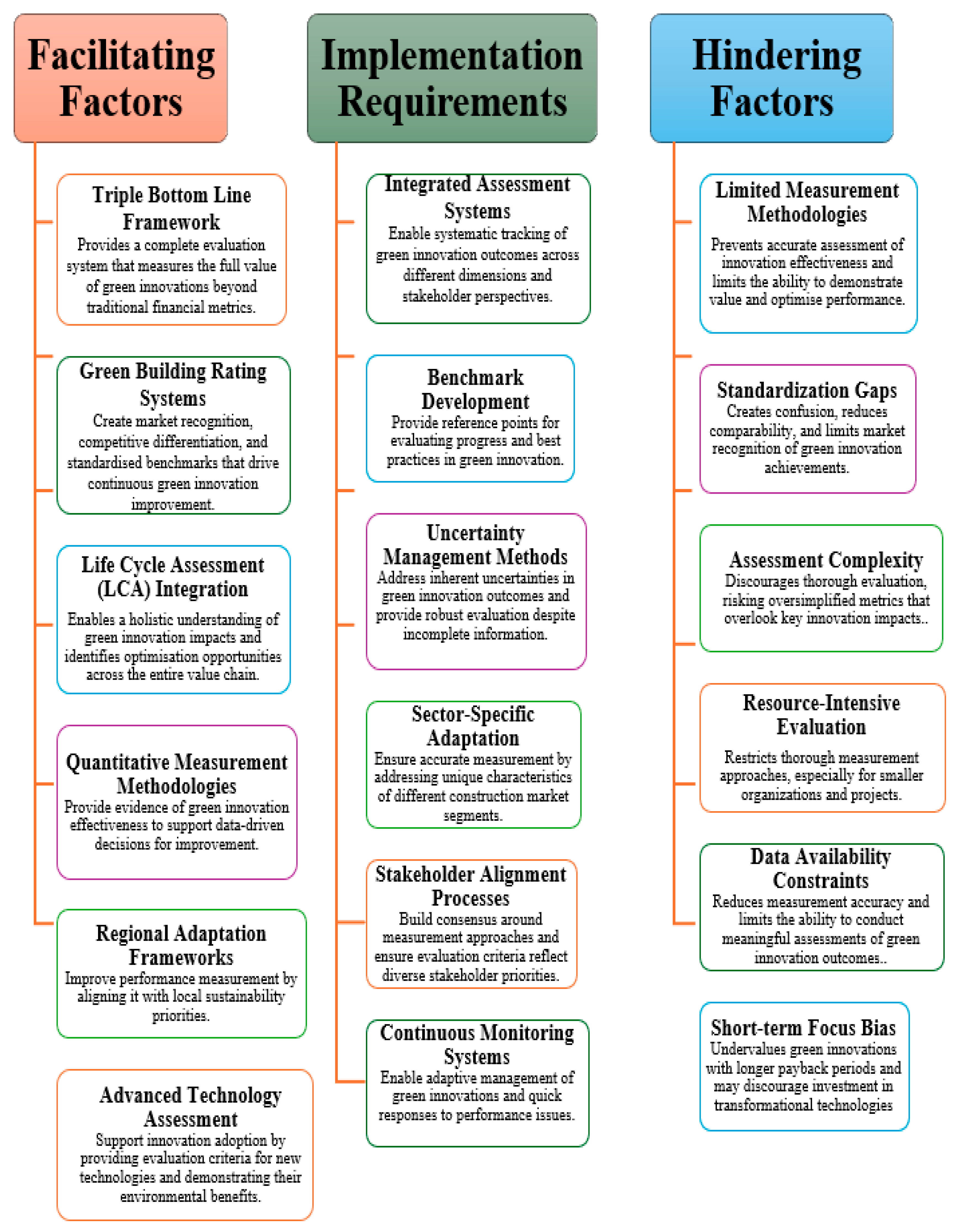 The contribution provides the first integrated systematic framework simultaneously examining four critical domains (green innovation, organizational capabilities, environmental governance, and performance measurement) through consistent tripartite categorization (facilitating factors, implementation requirements, and hindering factors) specifically within construction contexts. This integration reveals three novel insights: facilitating factors in one domain often serve as implementation requirements in others, hindering factors compound across domains, creating reinforcing negative cycles, and successful sustainability requires sequential capability building adapted to construction’s multi-domain complexity, shaped by project-based operations, fragmented supply chains, and regulatory heterogeneity.