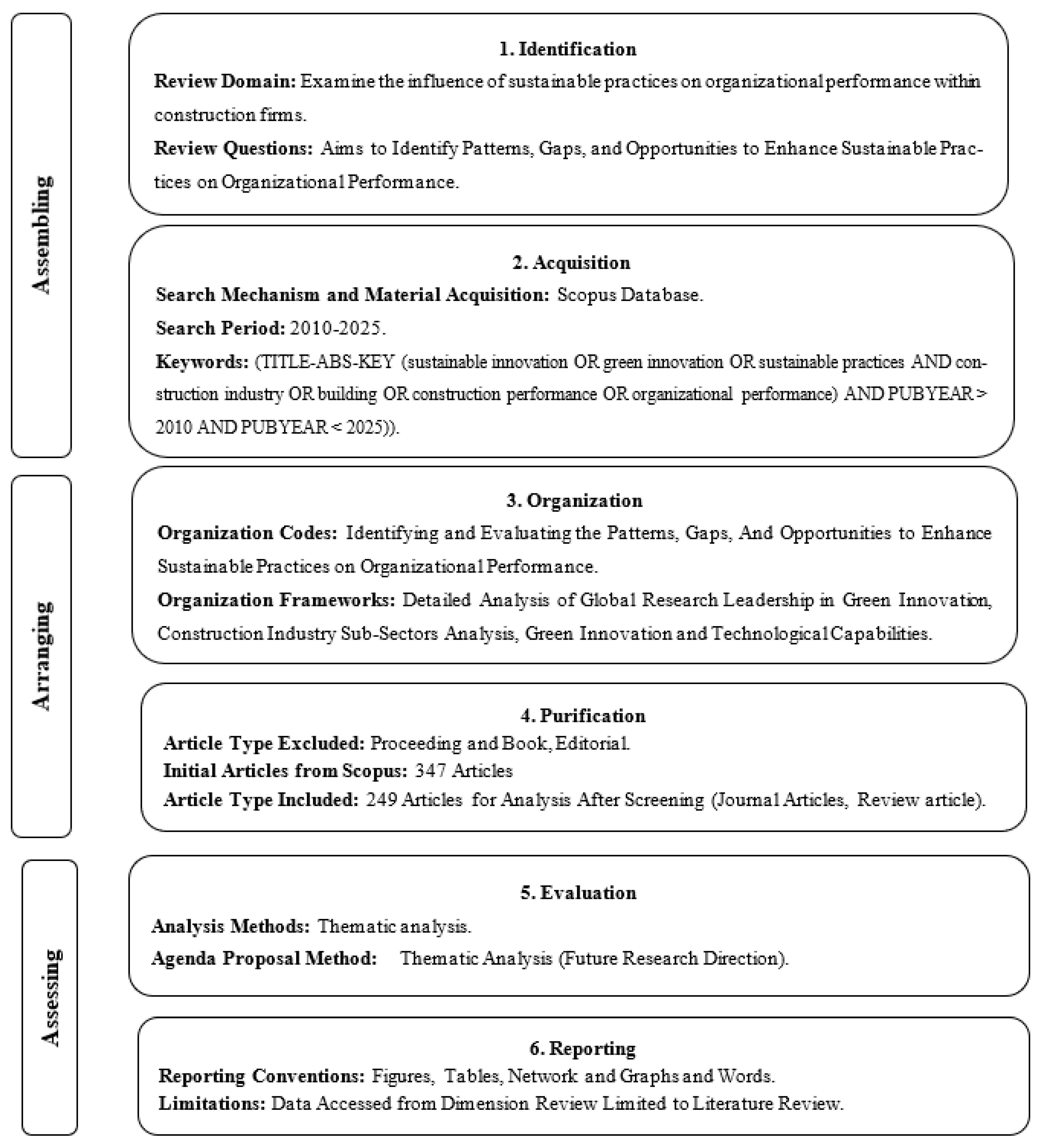 Despite several systematic reviews having examined construction sustainability, significant gaps remain. Prior reviews predominantly adopt a single-domain focus, examining green technologies, materials, or certifications in isolation, obscuring cross-domain interactions critical for successful implementation. Existing reviews inadequately address construction’s distinctive characteristics, project-based discontinuity, fragmented networks, and regulatory heterogeneity, often applying manufacturing frameworks without examining construction-specific mechanisms. Prior reviews lack systematic theoretical integration with the Natural Resource-Based View (NRBV) and the Dynamic Capability View (DCV), limiting theoretical advancement. Finally, existing reviews provide limited actionable frameworks, offering general recommendations rather than structured guidance on capability development, interdependencies, and implementation sequences.