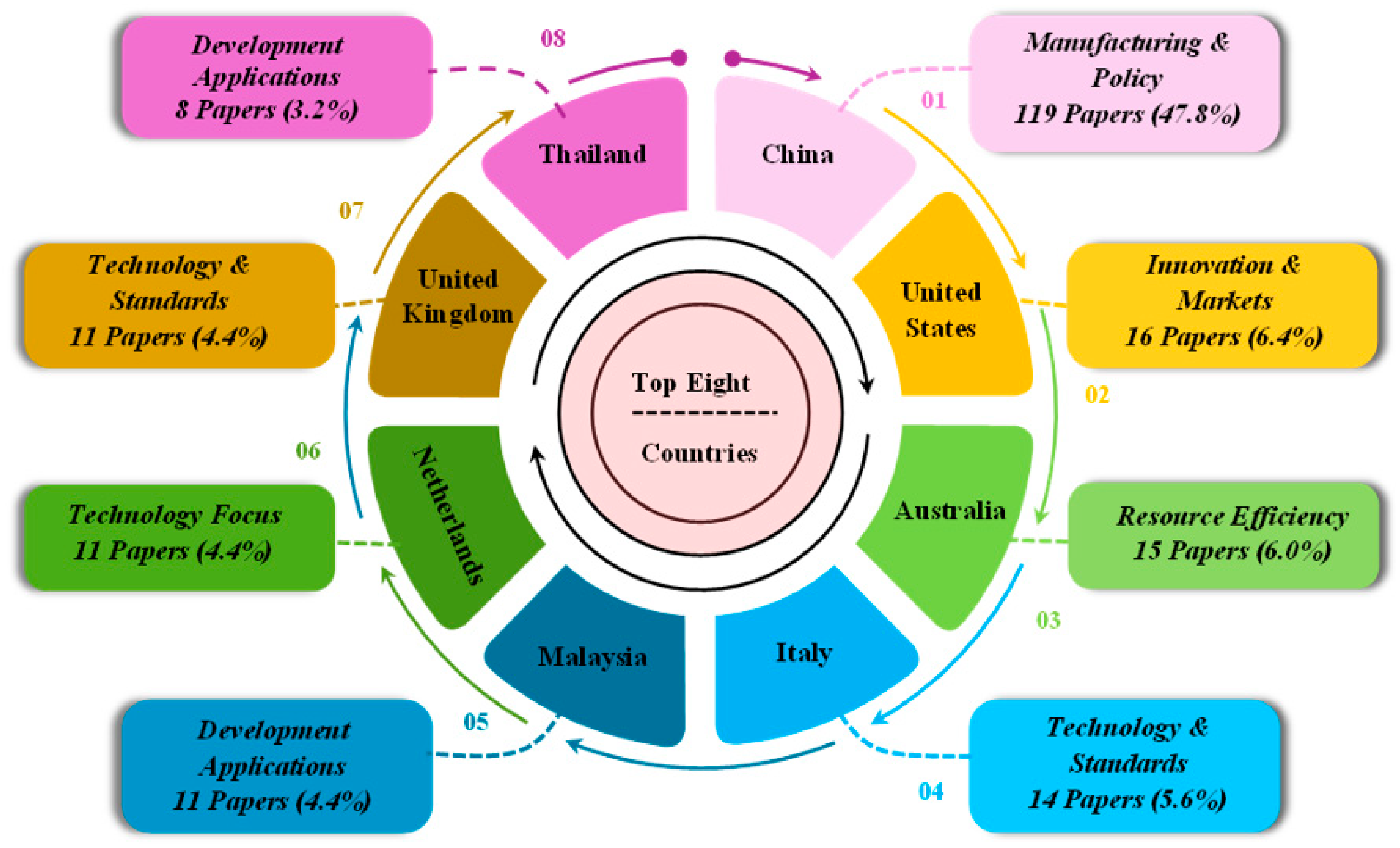 Environmental governance and regulatory drivers, with only 28 studies (11.2%), examine institutional forces and policy frameworks creating innovation incentives. Government policies form the core focus: carbon pricing, emissions regulations, renewable energy subsidies, and public procurement programs. Regulatory framework research explores how legislation structures organizational behaviour and drives compliance improvements. Institutional pressures encompass societal expectations, industry norms, investor demands, and consumer preferences [