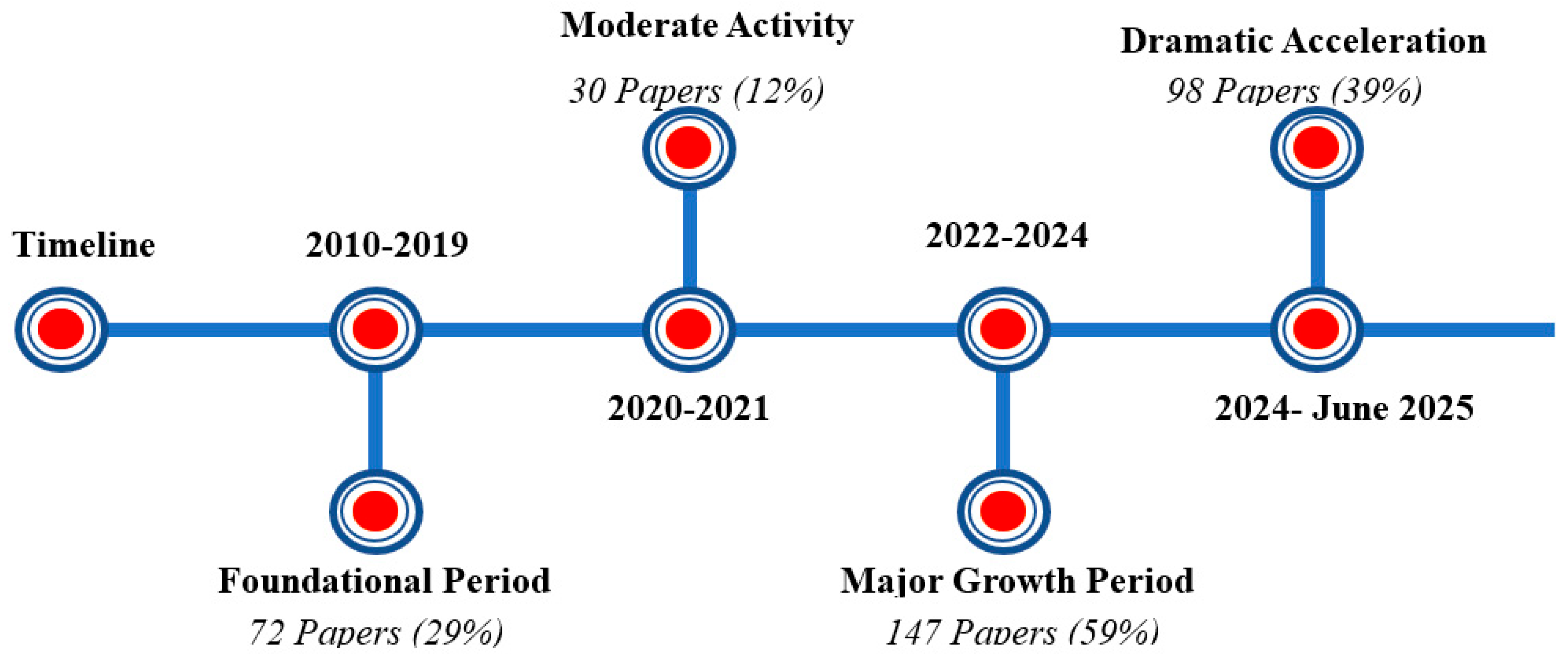 The surge in research output from 2024–2025, with 98 publications representing 39% of the total corpus, marks a significant shift in the focus on green innovation within the construction sector. Combined with 2022–2024 publications, this accounts for 59% of total output, indicating that nearly all relevant research has emerged in the last three to four years. This trend underscores the increasing importance of sustainable practices in construction, influenced by the ongoing climate crisis, substantial governmental support for green initiatives, and advancements in digital technologies. Key international frameworks such as the Paris Agreement, China’s 2060 carbon neutrality goal, and the European Green Deal further highlight the construction industry’s critical role in global energy consumption and emissions. In contrast, the foundational period from 2010–2019 yielded only 72 publications (29%), establishing theoretical frameworks. A brief lull in research activity in 2020–2021 (30 publications, 12%) likely resulted from COVID-19 disruptions, which inadvertently fostered a “coiled spring” effect leading to subsequent research proliferation.