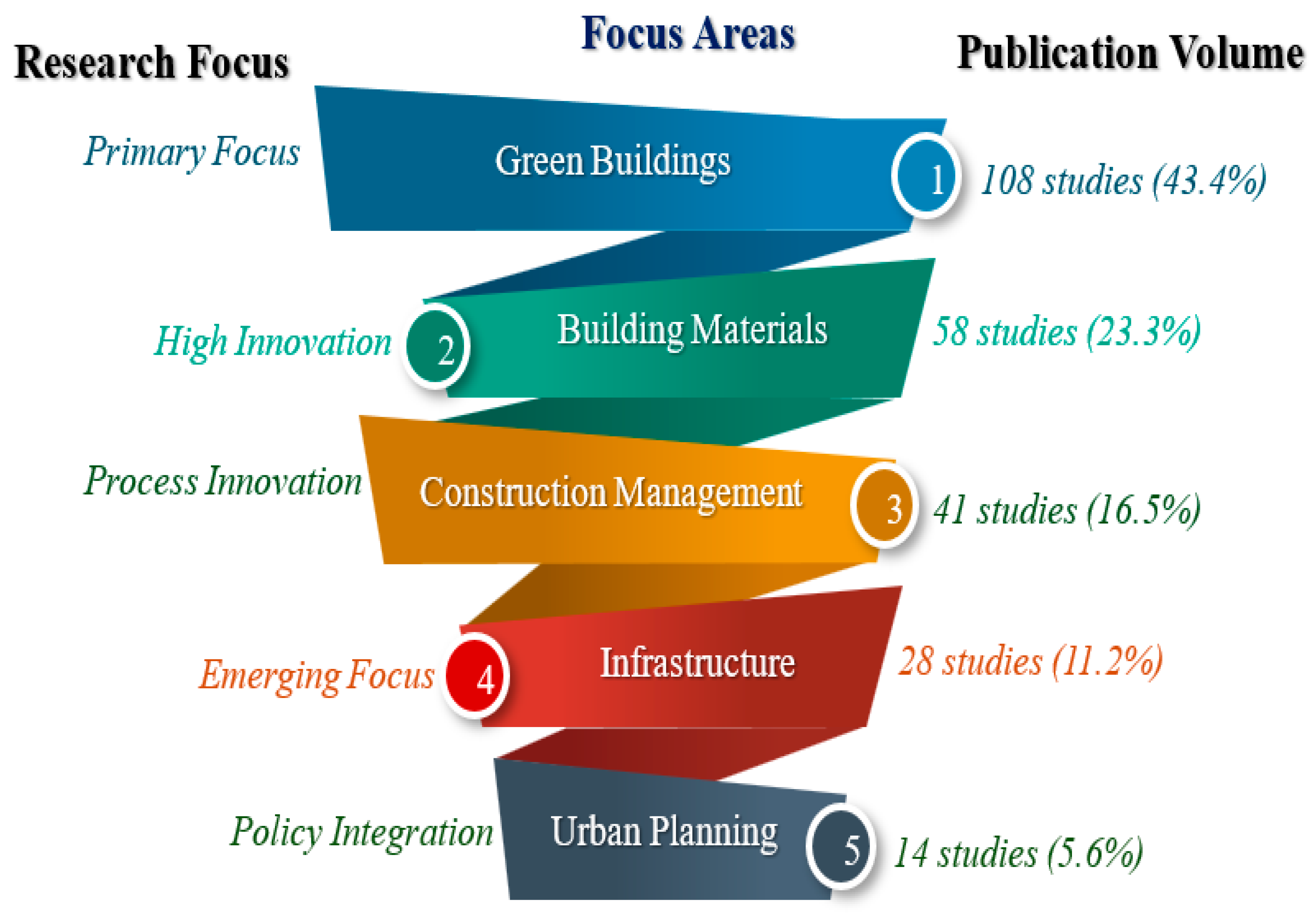 Despite the overall growth, this raises concerns about the validation and integration of recent studies within established theoretical contexts. The data illustrates a clear evolution from foundational studies to an era of rapid advancement, yet it shows notable gaps in critical areas such as infrastructure and urban planning. Research predominantly centres on green buildings (43.4%, 108 studies) and building materials (23.3%, 58 studies), while construction management gains moderate attention (16.5%, 41 studies). However, infrastructure (11.2%, 28 studies) and urban planning (5.6%, 14 studies) are underrepresented. This imbalance indicates a need for broader systemic approaches to sustainability, suggesting significant research gaps remain unaddressed in the discourse on holistic sustainable development.