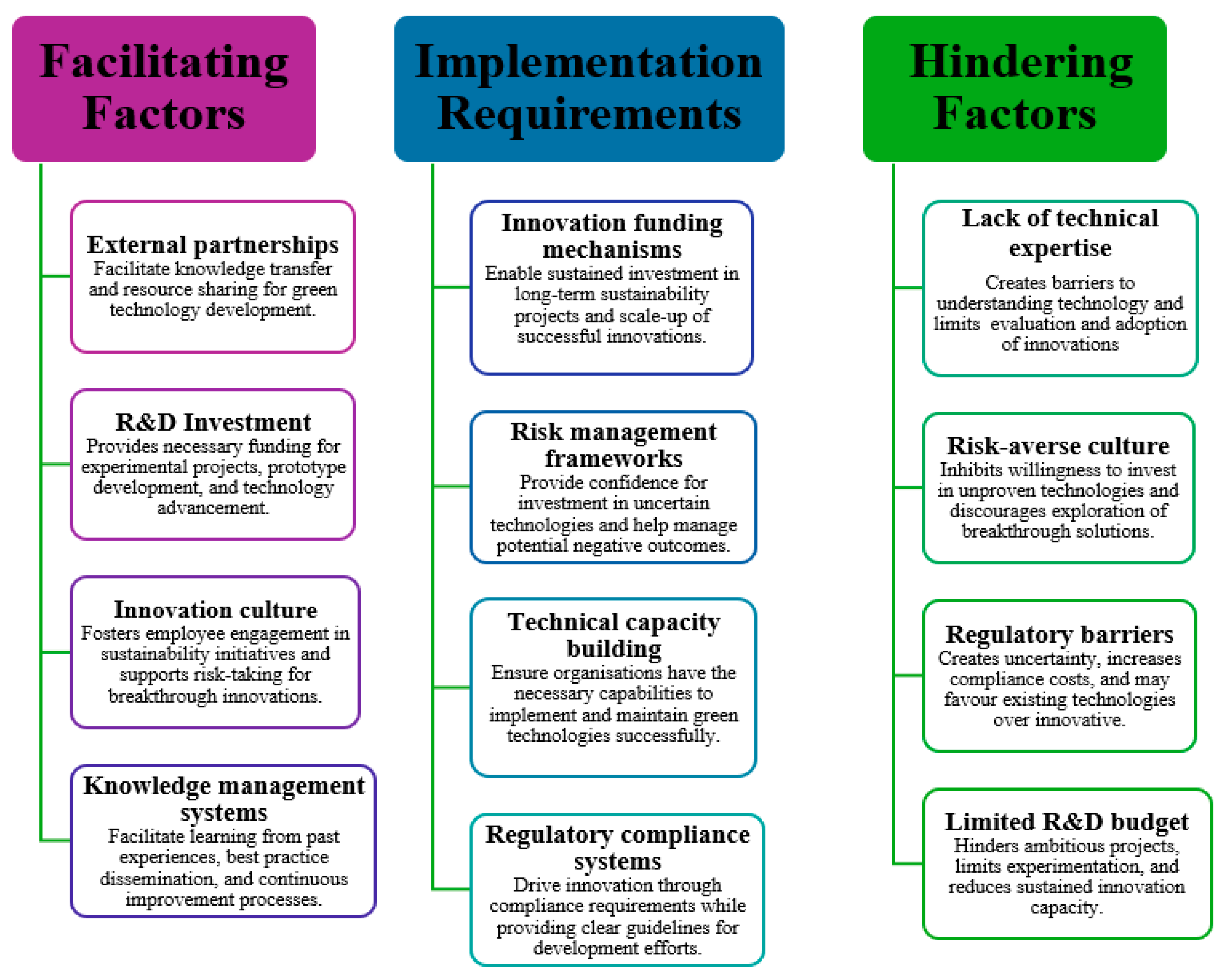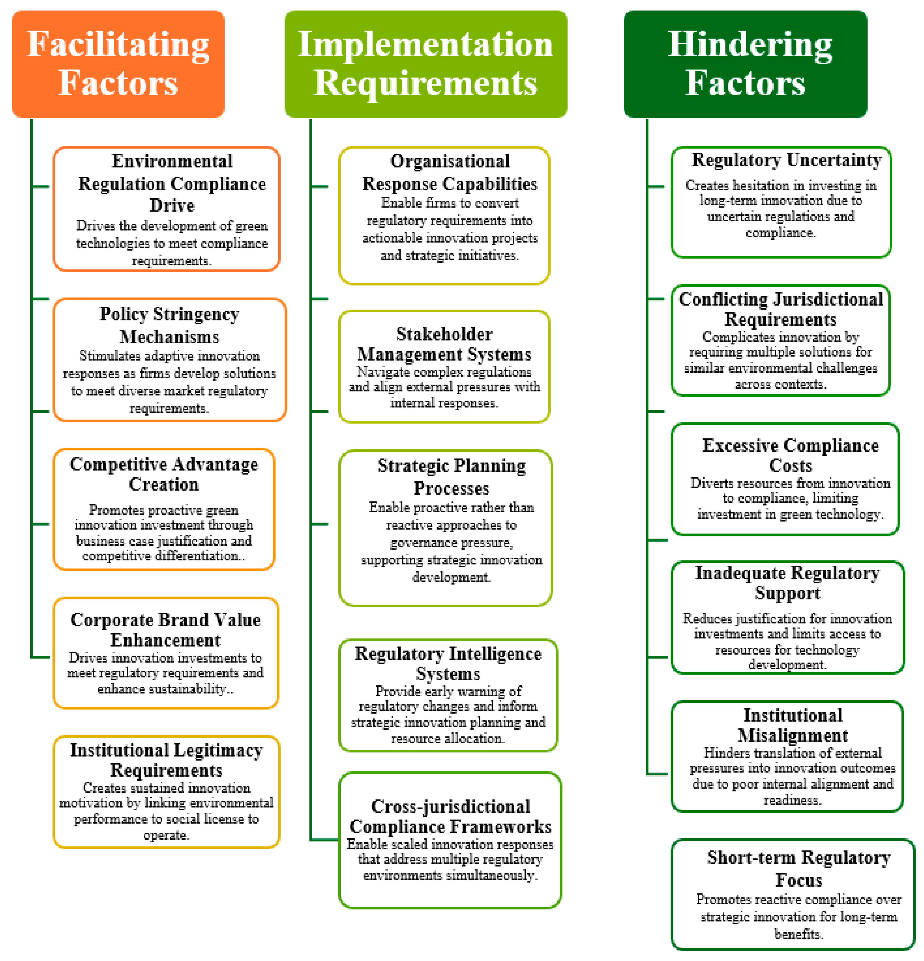 Figure 7 presents a systematic classification of factors affecting green innovation development, distinguishing between enablers that promote innovation, organisational requirements necessary for implementation, and barriers that obstruct progress.