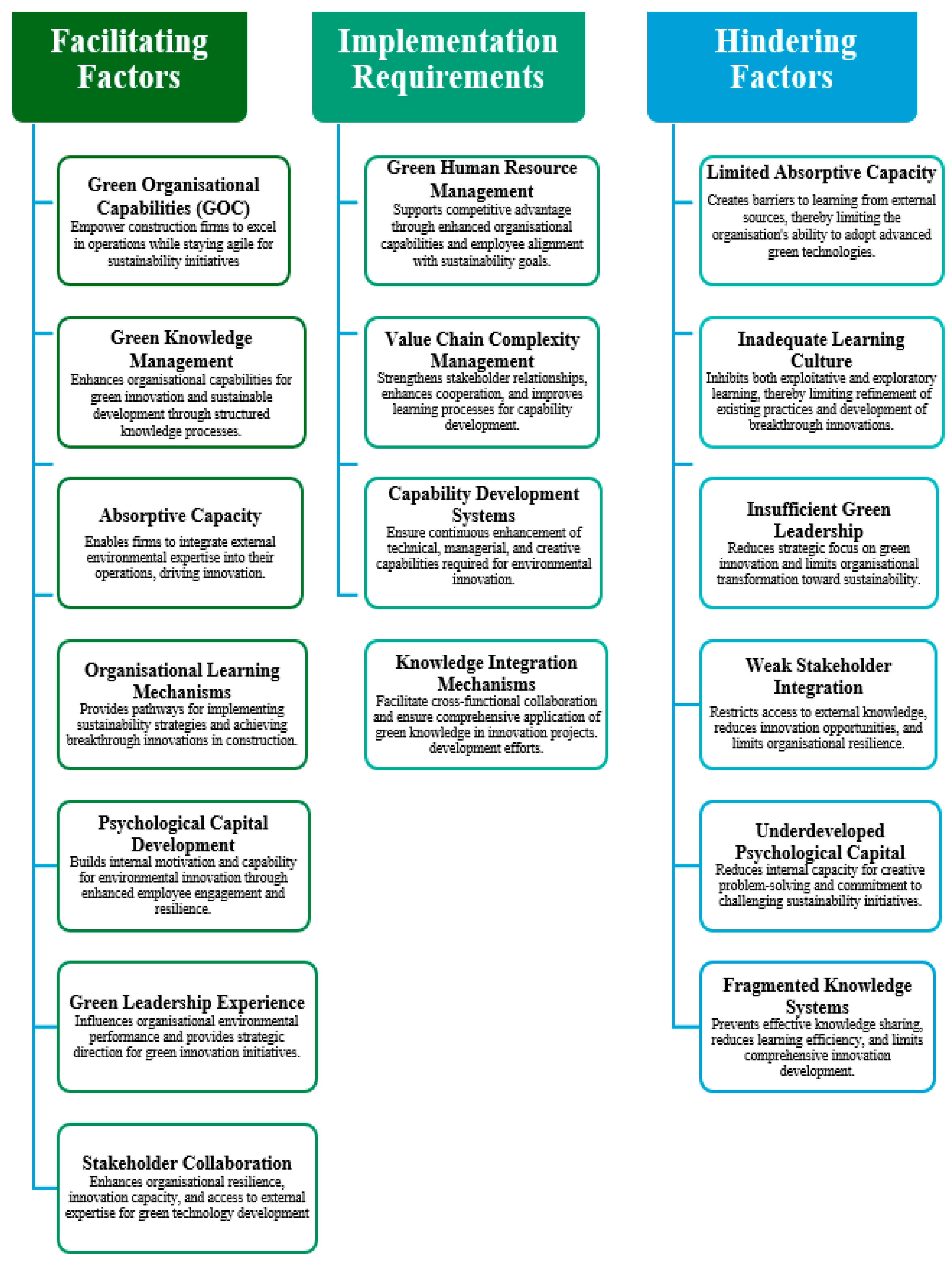 Figure 8 presents a comprehensive analytical framework examining how organisational capabilities and learning mechanisms influence green innovation development, specifically within construction firms. The framework categorises 18 distinct factors into three groups: facilitating factors (seven enablers that actively promote green innovation), implementation requirements (four necessary organisational systems for executing green strategies), and hindering factors (six barriers that obstruct environmental innovation progress). This structure shows the complex interplay between organisational enablers and constraints that determine green innovation success.
