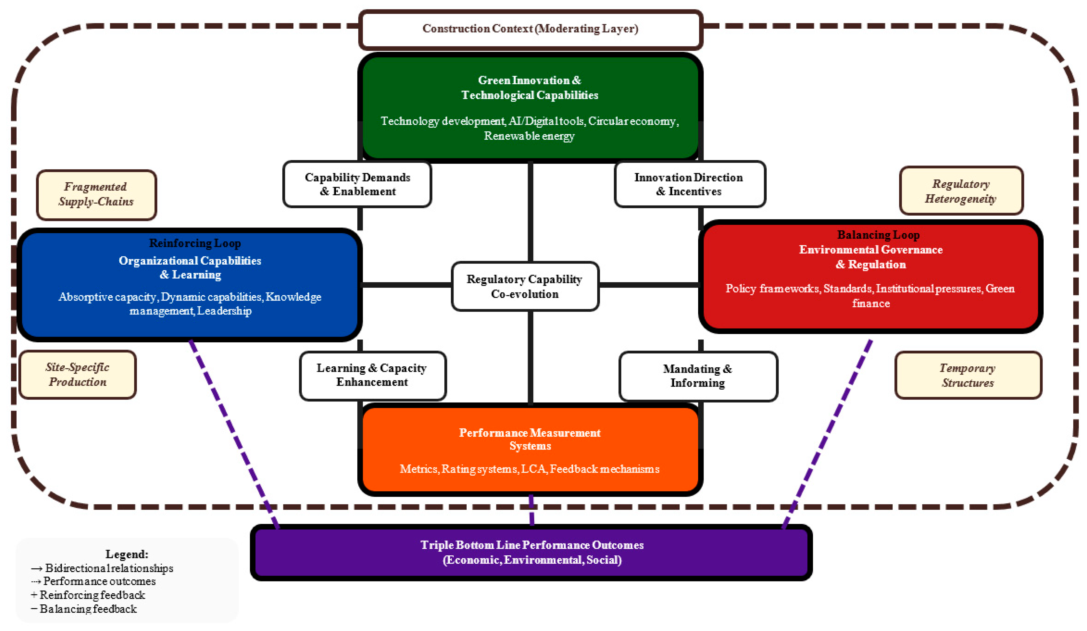 The six cross-domain interactions described above operate simultaneously, creating system-level dynamics exhibiting emergent properties not reducible to individual domain analysis. Three system-level dynamics merit particular emphasis. First, reinforcing feedback loops creates virtuous or vicious cycles. Strong organizational capabilities enable effective regulatory compliance, generating positive performance outcomes, legitimizing further capability investment, which enhances compliance effectiveness, further creating exponential capability growth. Conversely, weak capabilities result in compliance struggles, poor performance, reduced investment, and further capability erosion, creating downward spirals. These feedback dynamics explain performance divergence between construction sustainability leaders and laggards despite similar external pressures.