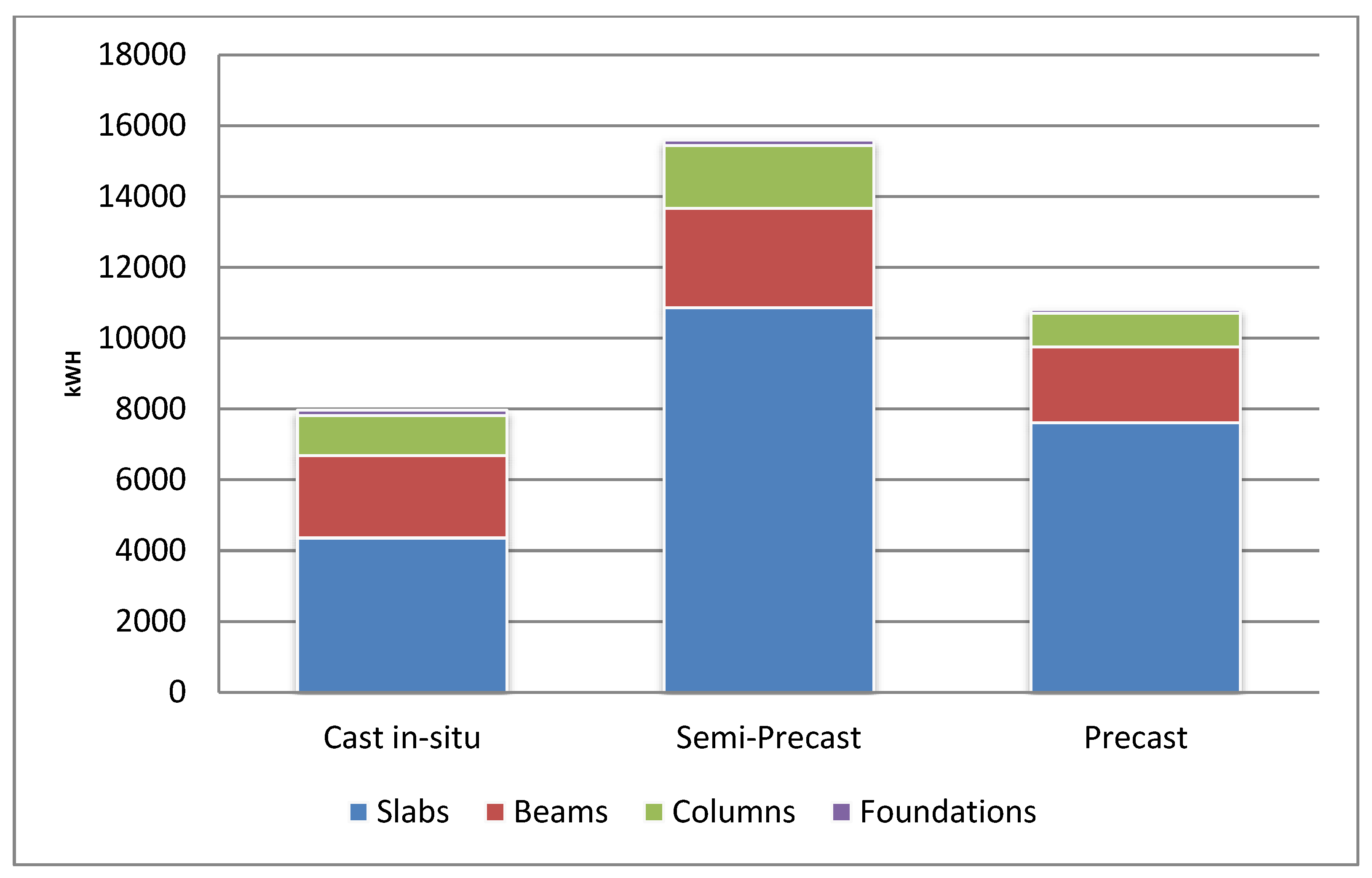 - Overall, it can be concluded that, from a global aspect, the energy consumption is comparable for the three construction techniques, having precast construction consuming slightly higher than semi-precast (1.9%) and cast in situ (5%) methods. From the local perspective, the semi-precast construction has significantly higher energy consumption, as it requires both extensive plant and site operations due to mixed construction. It is also evident that cast in situ and precast construction have comparable energy consumption. Cast in situ has the least amount of plant operations but the highest impact on transportation and site operations. On the other hand, precast has the highest plant operations in a controlled environment and the least extensive transportation and site operations. This implies that although they have similar energy consumptions, precast has an advantage that site operations are minimised, resulting in fewer labour operations and traffic impacts overall.