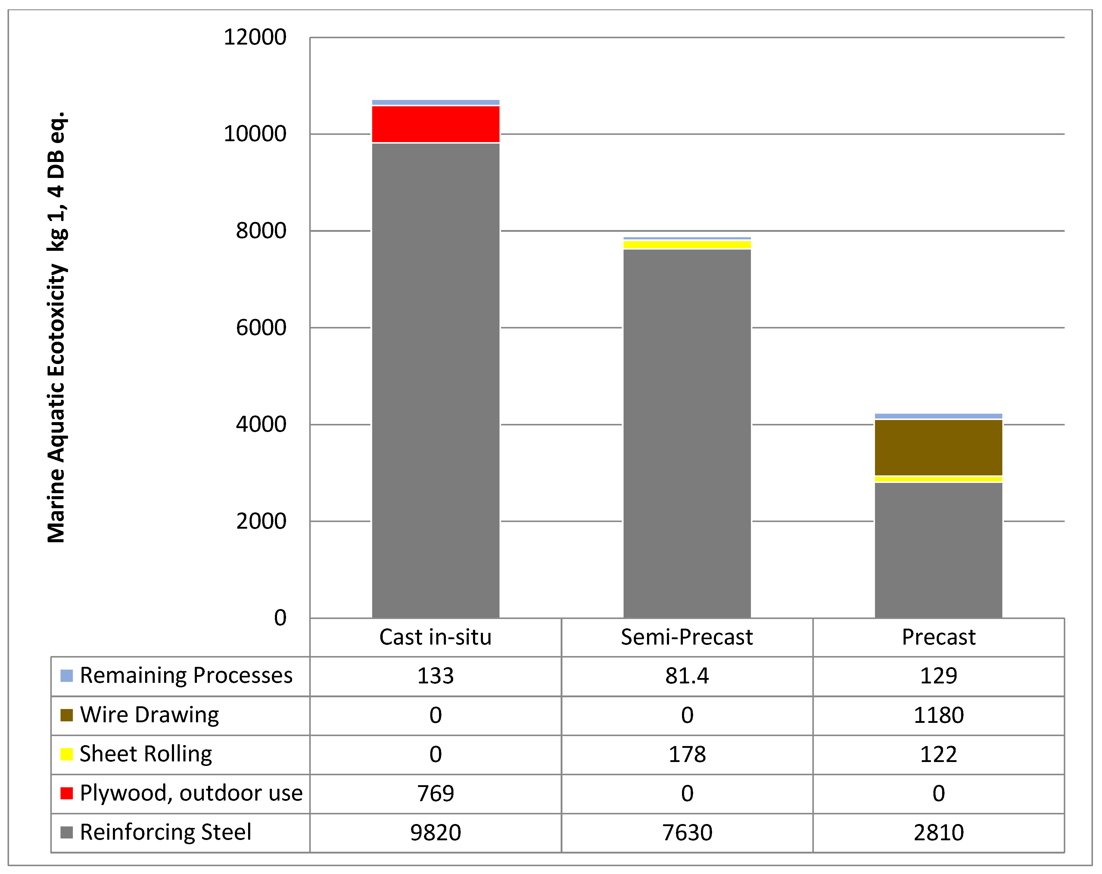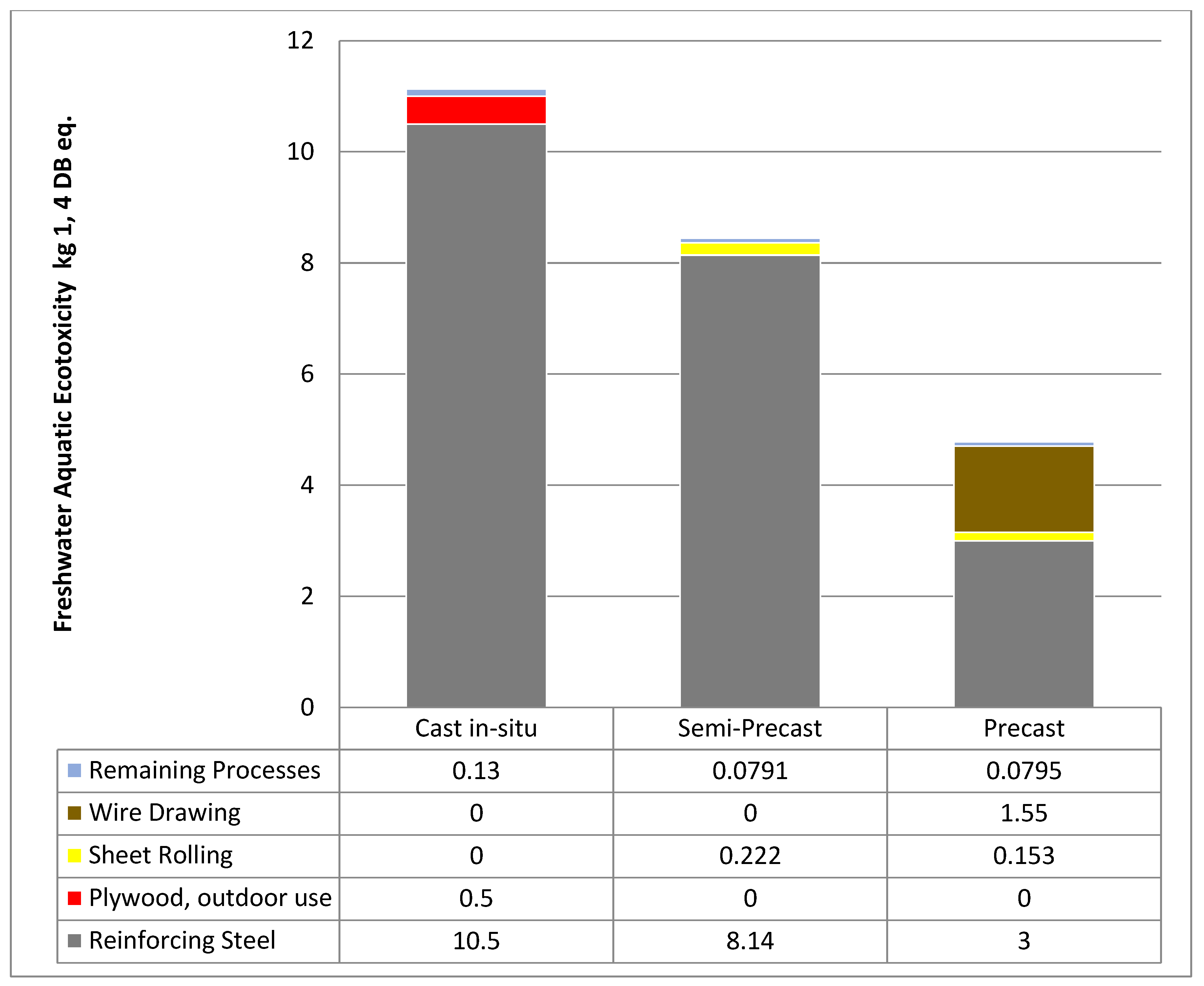 - Cast in situ construction exhibits significantly higher impacts in abiotic depletion, freshwater, marine and terrestrial ecotoxicity. These results were related to the higher use of steel in this construction method.