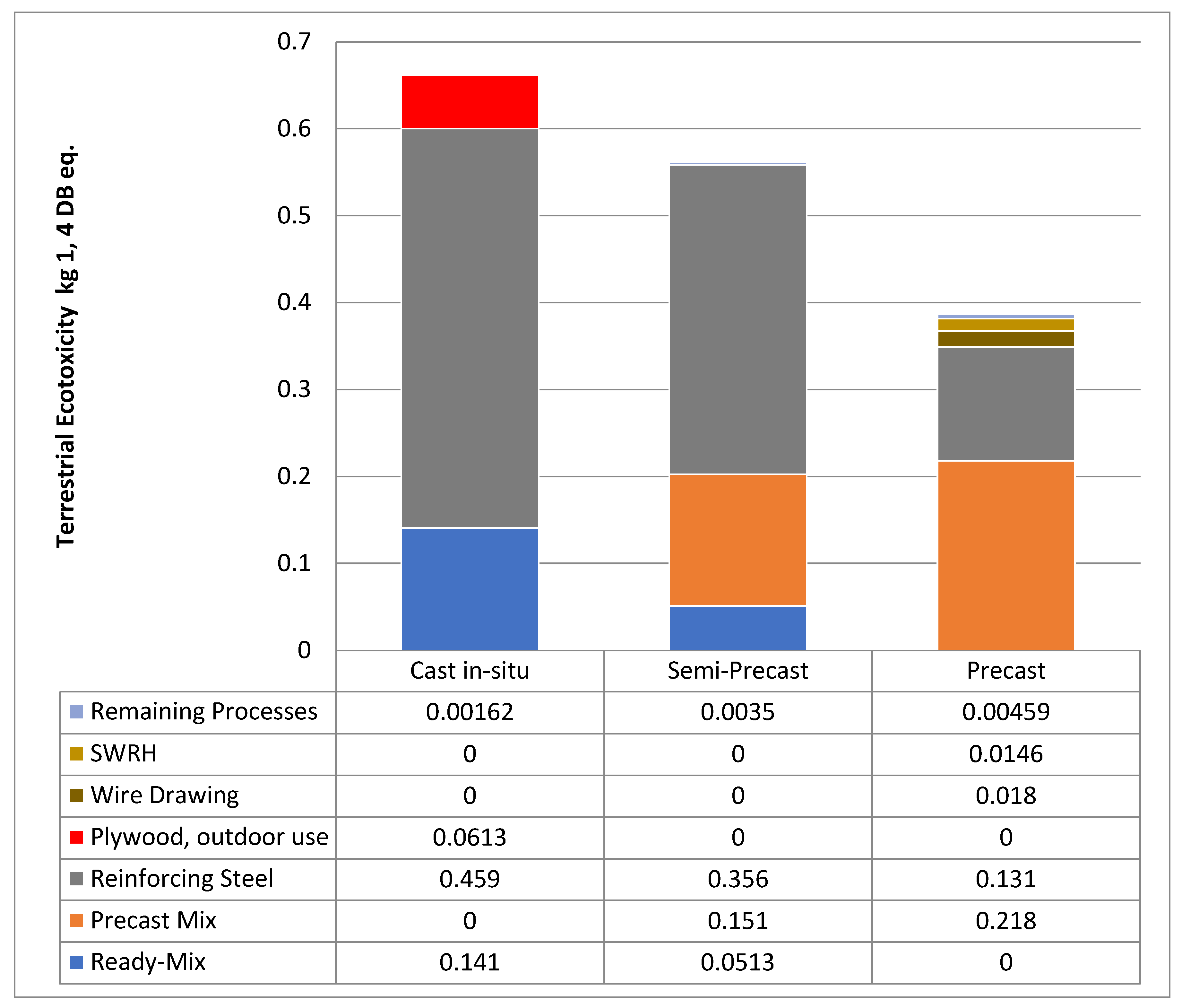 - The overall environmental impact of polystyrene in semi-precast construction was minimal; hence, in all other impact categories, it was considered under “Remaining Processes”.