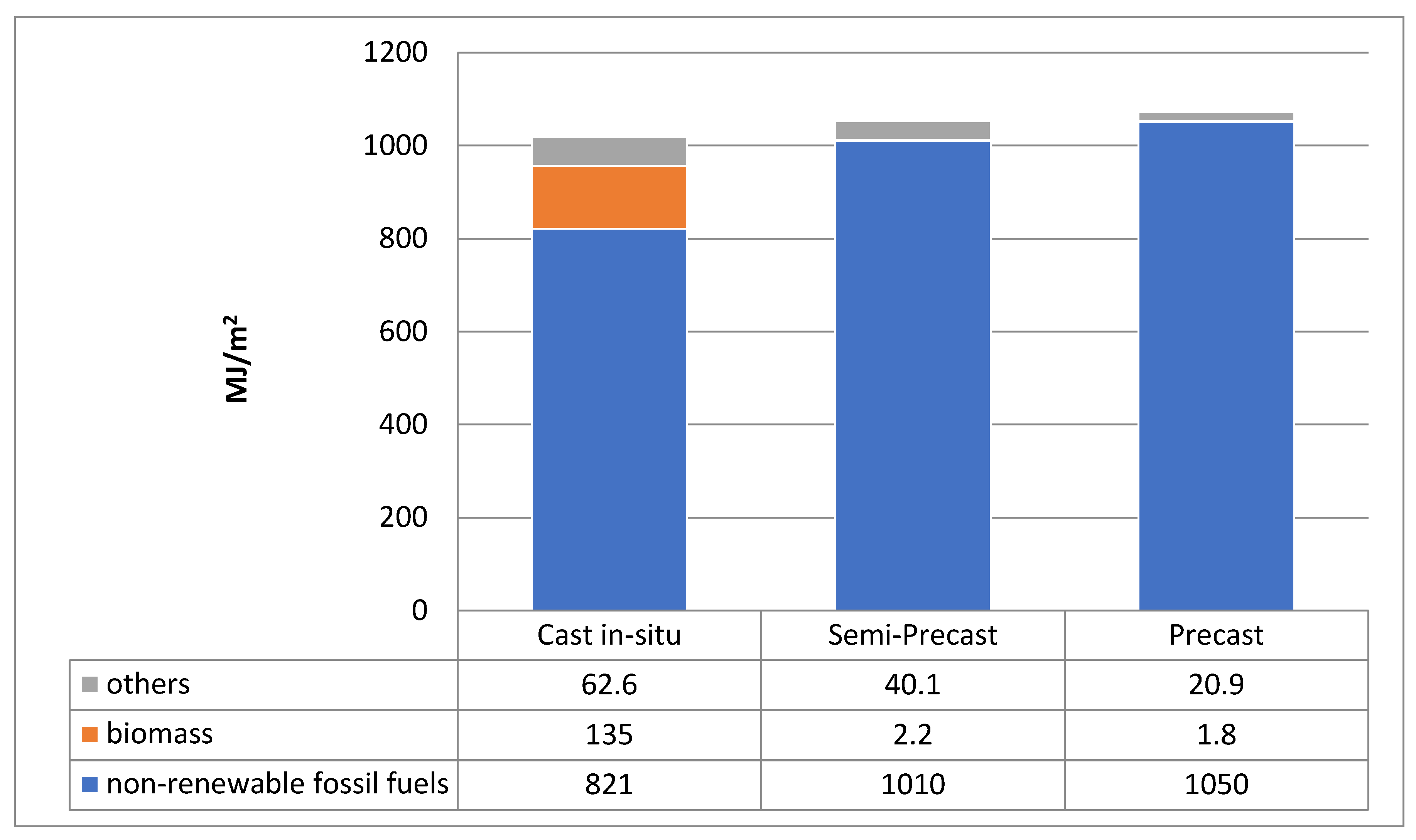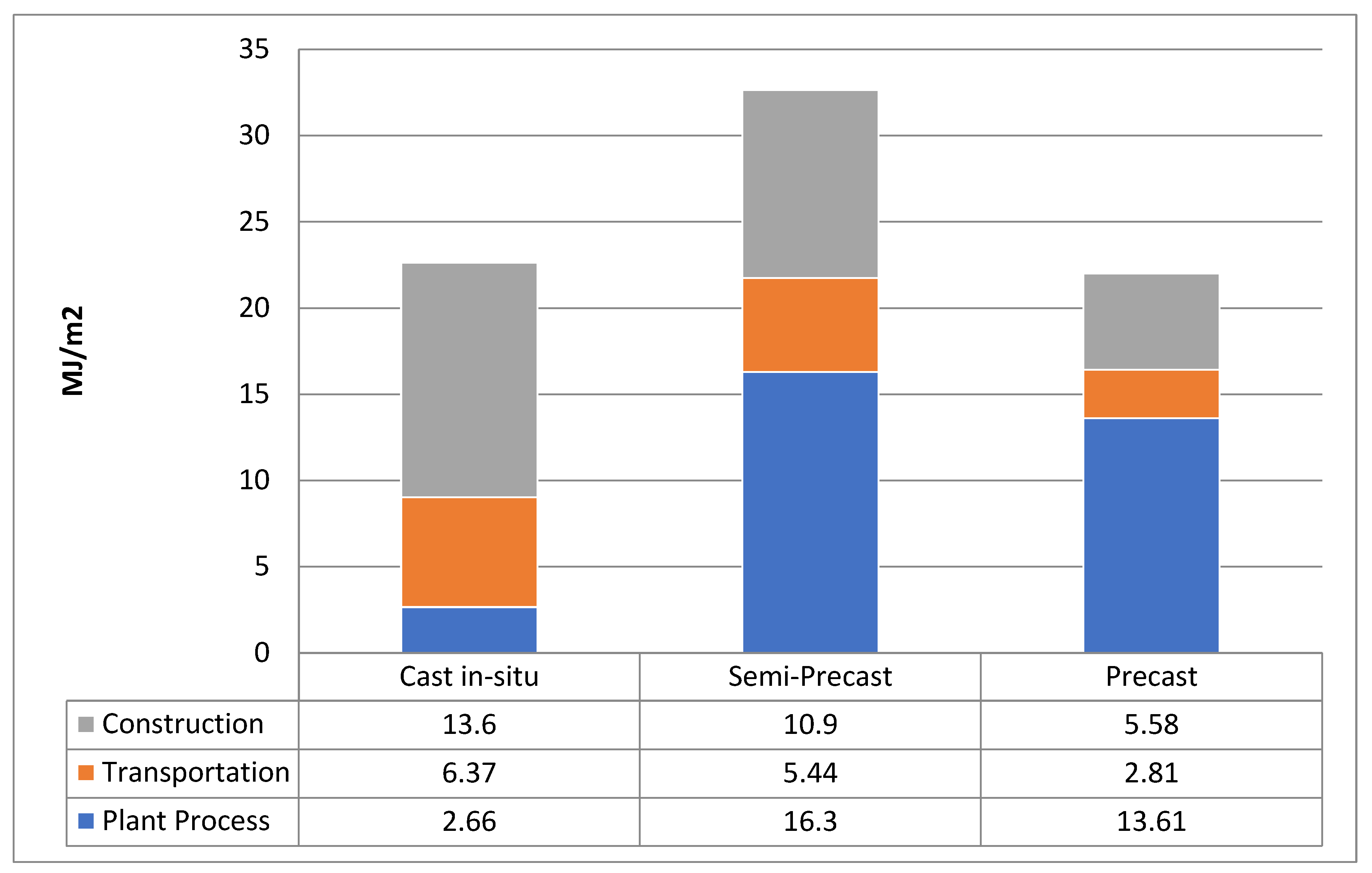 - The total energy consumption required for cradle-to-gate for all construction methods is similar, with an average value of 1047 MJ/m2 floor area. On a local aspect, the most energy-demanding method is attributed to semi-precast, having 32.6 MJ/m2, whilst cast in situ and precast constructions have similar demands, using around 22.5 MJ/m2.