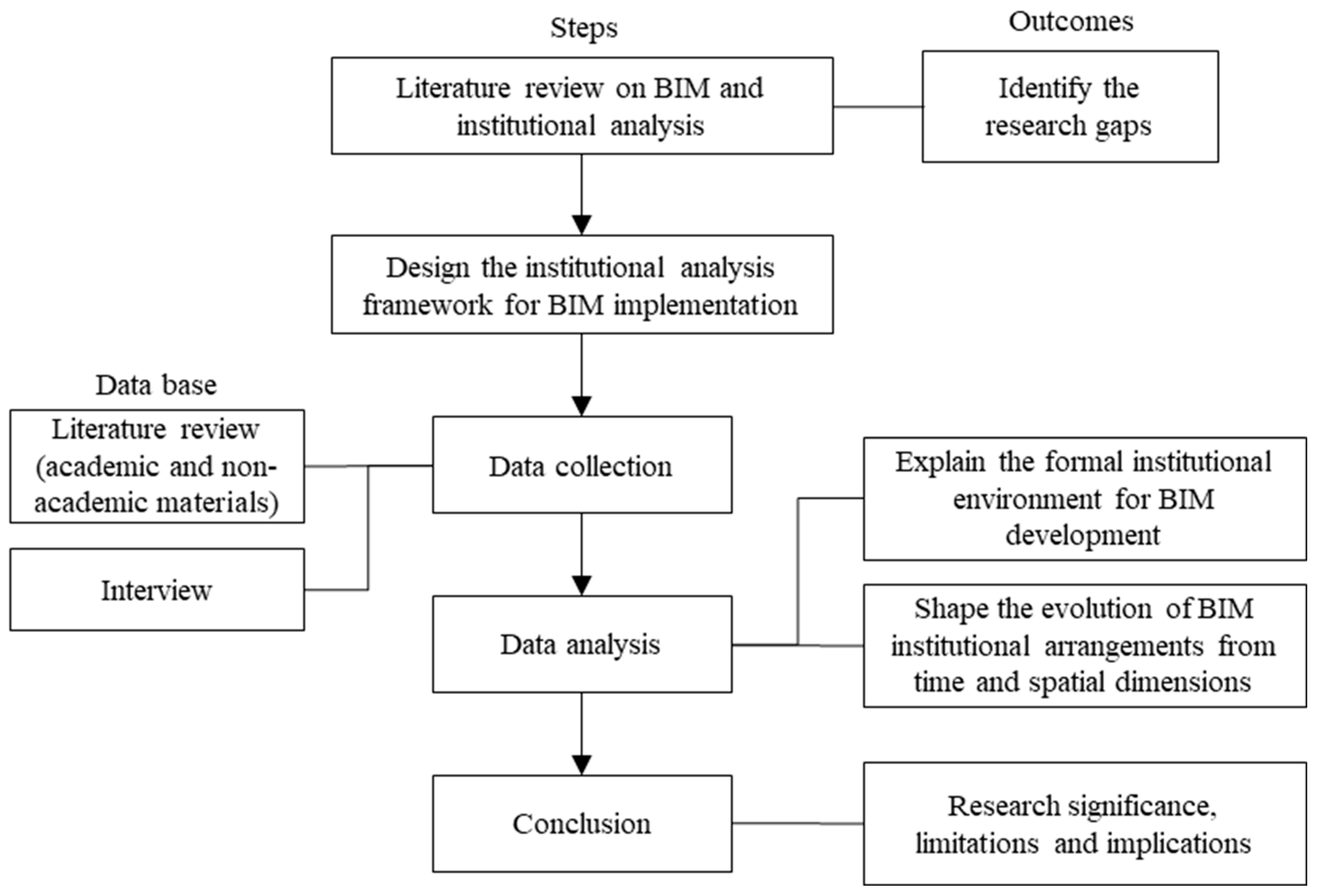 A comprehensive literature review was conducted to establish a theoretical foundation and identify research gaps. Given that the examination of institutional arrangements is highly context-dependent, multiple forms of evidence were utilized. The study began with a targeted literature search to confirm the research problems. A comprehensive data collection and processing were then conducted to investigate the implementation of BIM in China, as well as the institutional environment. The research data included a review of the academic literature, market reports, standards and policy documents, and in-depth interviews. The research flow is shown in