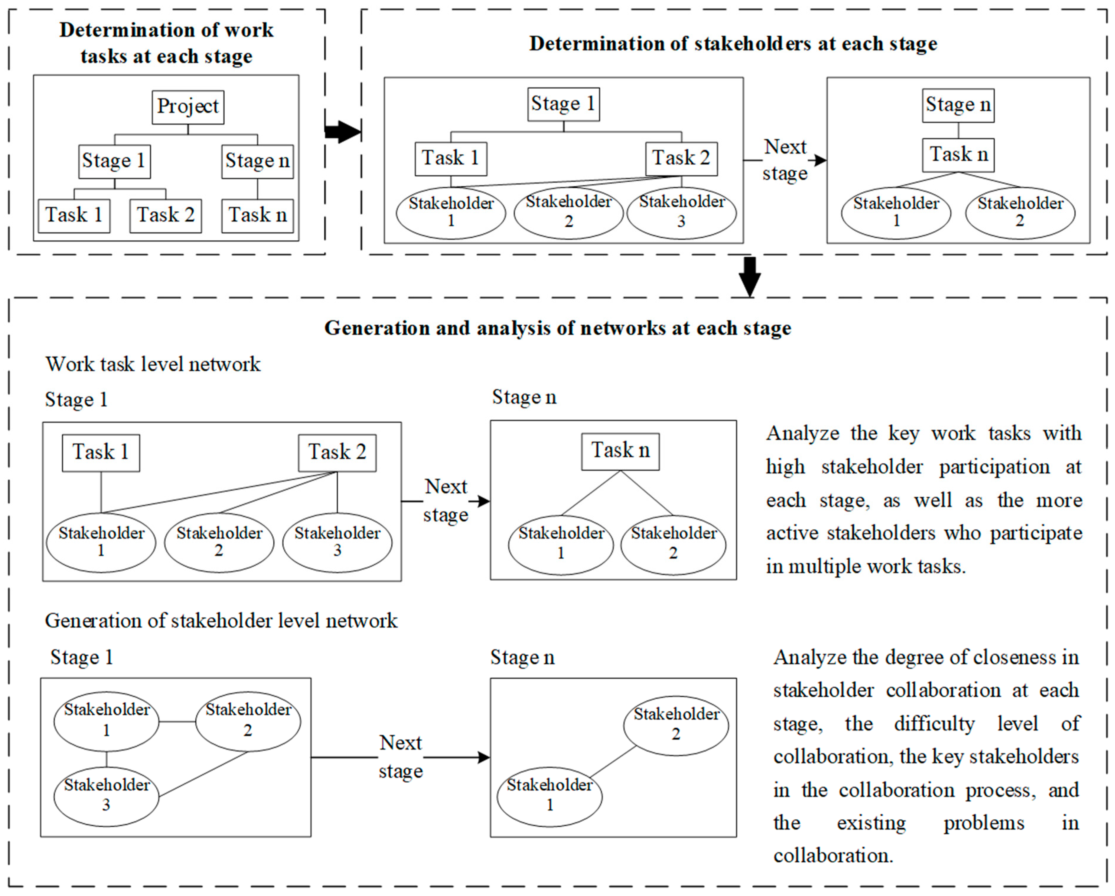 18] employed a four-level WBS to identify stakeholder collaboration relationships in railway projects, using collaboration frequency to quantify relationship strength. This study demonstrated the theoretical feasibility of using collaboration frequency for quantification. However, it did not generate or analyze task-level networks, nor did it examine the impact of work tasks on stakeholder collaboration relationships across project phases. This study indicates the necessity of integrating project phases with stakeholder relationship research, but it did not further explore key work tasks at each phase or the impact of work tasks on stakeholder relationships. Building upon the above research, this paper establishes an analytical framework for construction project stakeholder collaboration. It comprehensively considers the influence of factors such as work tasks and stakeholder responsibilities on collaborative relationships, enabling the analysis and exploration of stakeholder collaboration across project phases. Consequently, this framework provides a reference for coordinating construction project stakeholders, aiming to enhance collaborative efficiency among all parties involved.