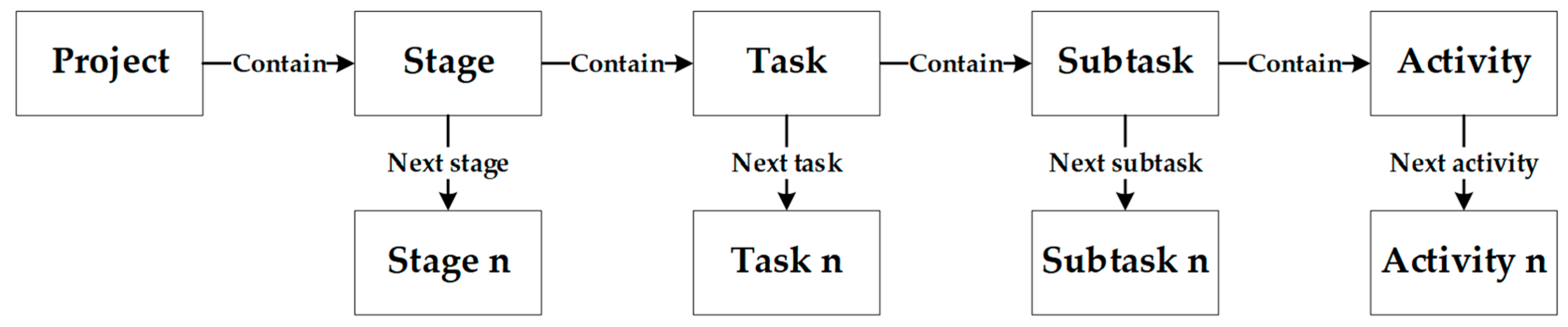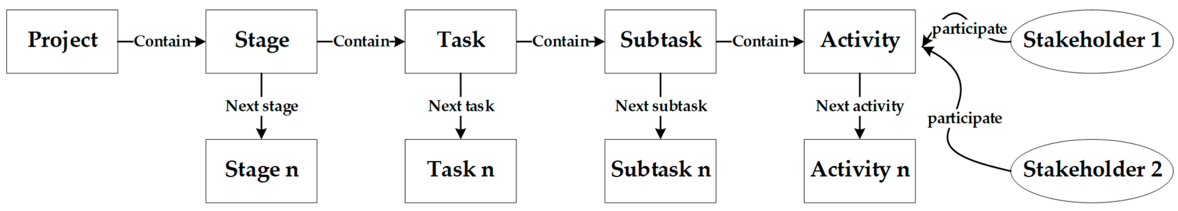 Through literature analysis and interviews with personnel from general contracting units, BIM consulting firms, and real estate enterprises, it was found that most construction projects in China adopt a 4-level WBS (including the project level). Different managing entities may develop different WBSs; for example, the owner’s WBS may differ from the general contractor’s. Furthermore, many enterprises with general contracting qualifications develop their own generic project WBS. In practice, the lowest-level work unit often comprises multiple work activities. For instance, the work unit “Construction Drawing Design” can be further decomposed into design activities for different disciplines and inter-disciplinary information exchange activities. Therefore, to objectively identify and quantify collaboration among parties, an activity level is added to the WBS hierarchy based on literature analysis and interview results.