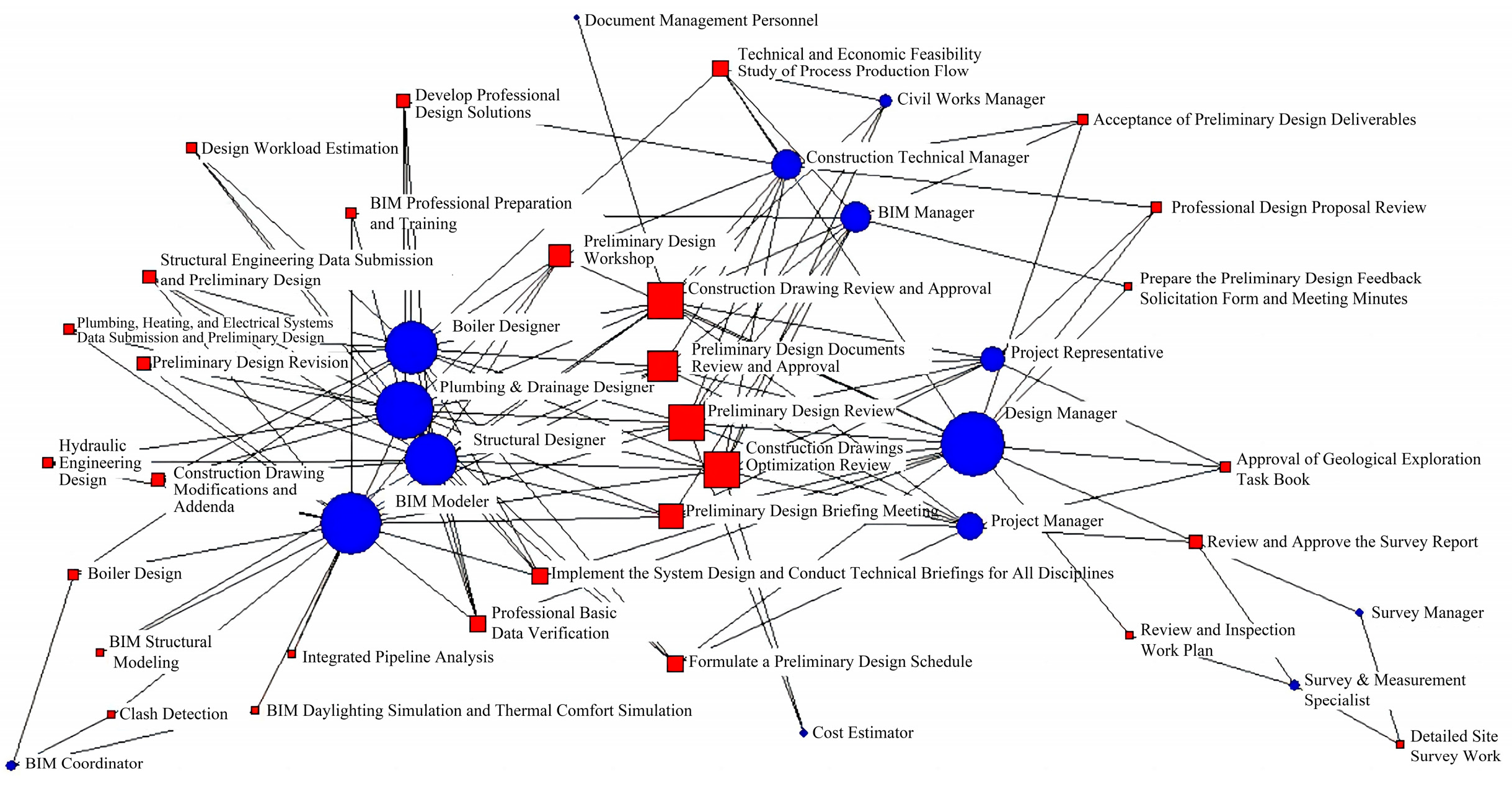 Figure 6. In these visualizations, square nodes represent work activities, circular nodes represent stakeholders, and connecting lines indicate participation. A preliminary visual analysis of the Design Phase network indicated that activities like ‘Preliminary Design Review’ and ‘Construction Drawing Optimization Review’ were central, involving numerous stakeholders. Key stakeholders appeared to be the Design Manager (S4), various professional designers (S5, S6, S7), and BIM Modelers (S16).