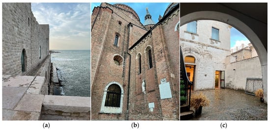 Figure 1. Historic masonry structures in Italy: (a) Trani Castle (Trani, Puglia); (b) Basilica di Sant’Antonio da Padova (Padova, Veneto); and (c) Civic Museum “Carlo Gaetano Nicastro” (Bovino, Puglia).