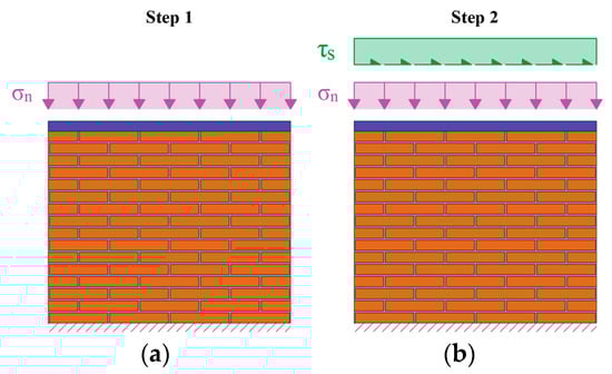 Figure 3. Experimental steps for shear tests: (a) application of the pre-compression load and (b) application of shear stress under constant pre-compression load.