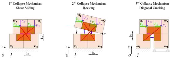 At the heuristic molecule scale, three shear collapse mechanisms can be identified: (i) sliding along the bed joint; (ii) rocking; and (iii) sliding with diagonal cracking. These mechanisms can be observed on panels at the macro-scale and can be applied at the meso-scale, i.e., at the heuristic molecule level (Figure 8), based on the relationships between external loads and bond-spring strengths.