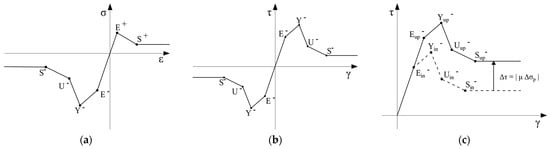 Figure 9. Stress–strain laws adopted for bond-springs: (a) horizontal and vertical axial and diagonal bond-springs; (b) horizontal and vertical shear springs; and (c) the variation of the skeleton curve for modeling the Coulomb-like behavior, where points labeled as “initial” refer to the initial skeleton curve and points labeled as “updated” refer to the updated skeleton curve at the current time increment.