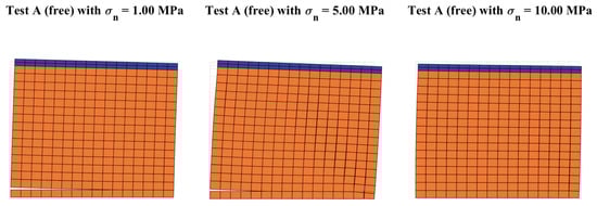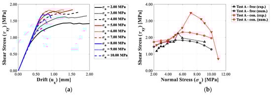 The results obtained from the primary test series (A) are analyzed in terms of capacity curves, interaction domains, collapse mechanisms, and strain maps. Coherently with the Coulomb-like frictional behavior, the pre-stressing load does not affect the elastic response of the panel (Figure 10a). Below the threshold, σ n = 6.00   M P a , an increase in the pre-compression load corresponds to an increase in strength, while above this threshold, a decrease in strength is observed. When the pre-compression load increases, a reduction in ductility is always observed.
