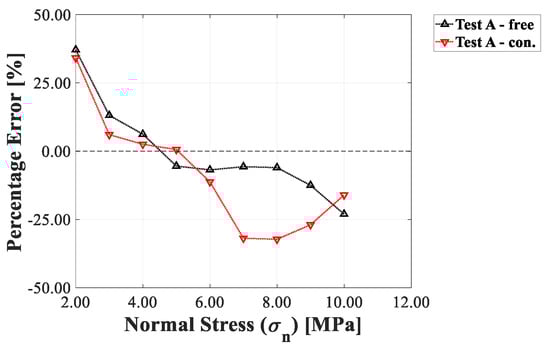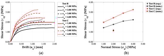 To analyze the ability of the implemented numerical model in reproducing the experimental results, the percentage error obtained when evaluating the peak shear stress for each applied pre-compression load was computed and is shown in Figure 11. In most of the numerical tests, the error is generally within a range of +/−25%, which can be considered satisfactory.