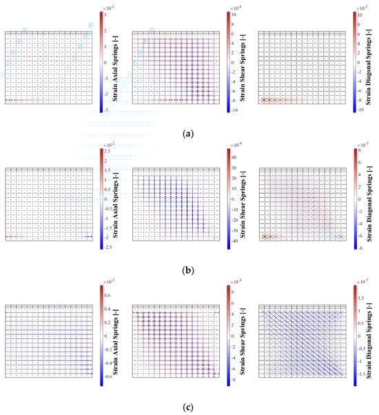 Figure 13. Strain maps from the numerical simulations of Test A panels (unrestrained), panels with a pre-compression load of: (a) 1.00 MPa; (b) 5.00 MPa; and (c) 10.00 MPa.