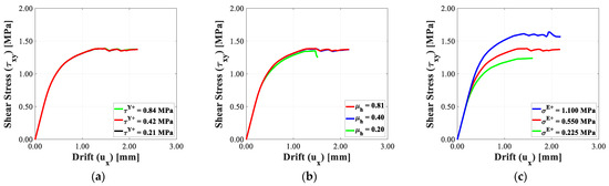 The numerical results obtained for Tests B and C showed that a decrease in the panel height led to an increase in shear strength. The capacity curves determined for Tests B and C (Figure 15a) followed the trends already outlined for Test A. The trends observed for Test A were also observed for the interaction domains (Figure 15b).
