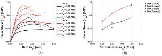 Both experimentally and numerically, a decrease in the panel width (Tests D and E) produces a decrease in the strength. The capacity curves (Figure 16a) show the same trends outlined for Test A, while the interaction domains (Figure 16b), with their typical geometry, are very close to the experimental value, σ n = 2.00   M P a .