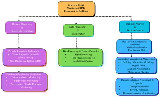 Visual inspections require the presence of trained inspectors who can quickly evaluate the infrastructure’s condition based on preset standards. This traditional approach is frequently expensive, time-consuming, and exacting. In addition, it may jeopardize the safety of experts, especially in circumstances where accessibility is limited [13,14]. Further, visual inspection also hinders real-time tracking of changes. Civil engineers created structural health monitoring (SHM) systems to address this issue, and they are gaining popularity in the field [15,16]. It focuses on the continuous or intermittent monitoring of the structural condition of engineering structures, such as buildings, bridges, dams, pipelines, etc. By continuously or sporadically assessing the condition of structures, SHM helps to ensure their safety. It makes it possible to identify damage, degradation, or structural irregularities early on, which could compromise the integrity of the building and put residents and the public in danger. SHM enables proactive maintenance methods by delivering real-time or near real-time data on structural conditions [17,18]. Early detection of problems enables prompt repairs or interventions, preventing small concerns from worsening into catastrophic structural failures, lowering the danger of costly repairs or replacements. SHM provides useful information about the performance and behavior of structures over time. However, anomalous data can greatly impact the evaluation of engineering structures’ performance. To prevent misjudging structural performance in SHM, anomalous data from measurements must be identified and eliminated [19]. For effective observation, SHM employs various sensing and inspection techniques based on physical principles, including vibration monitoring [20], radiography [21], eddy current testing [22], acoustic and ultrasonic emission-based monitoring [23,24], sensor-based monitoring, non-destructive testing [25,26], visual inspection, and remote sensing. AI and BIM-based methods are not physical monitoring techniques but serve as data-driven and integrative frameworks that enhance the interpretation, management, and utilization of information obtained from these sensing approaches [27,28]. Permanent sensors are installed on the structures of SHM systems to allow for numerous, regular measurements while the system is in operation [29,30,31,32]. Analyzing and comparing monitored data allows for timely detection of aberrant structural situations, initiating warnings and maintenance recommendations effectively [33,34,35,36,37,38].